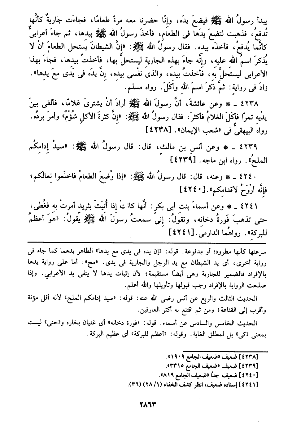 4238 - وعن عائشة، أن رسول الله صلى الله عليه وسلم أراد أن يشتري غلاما، فألقى بين يديه تمرا فأكل الغلام فأكثر، فقال رسول الله صلى الله عليه وسلم: ((إن كثرة الأكل شؤم)) وأمر برده. رواه البيهقي في ((شعب الإيمان)). [4238]