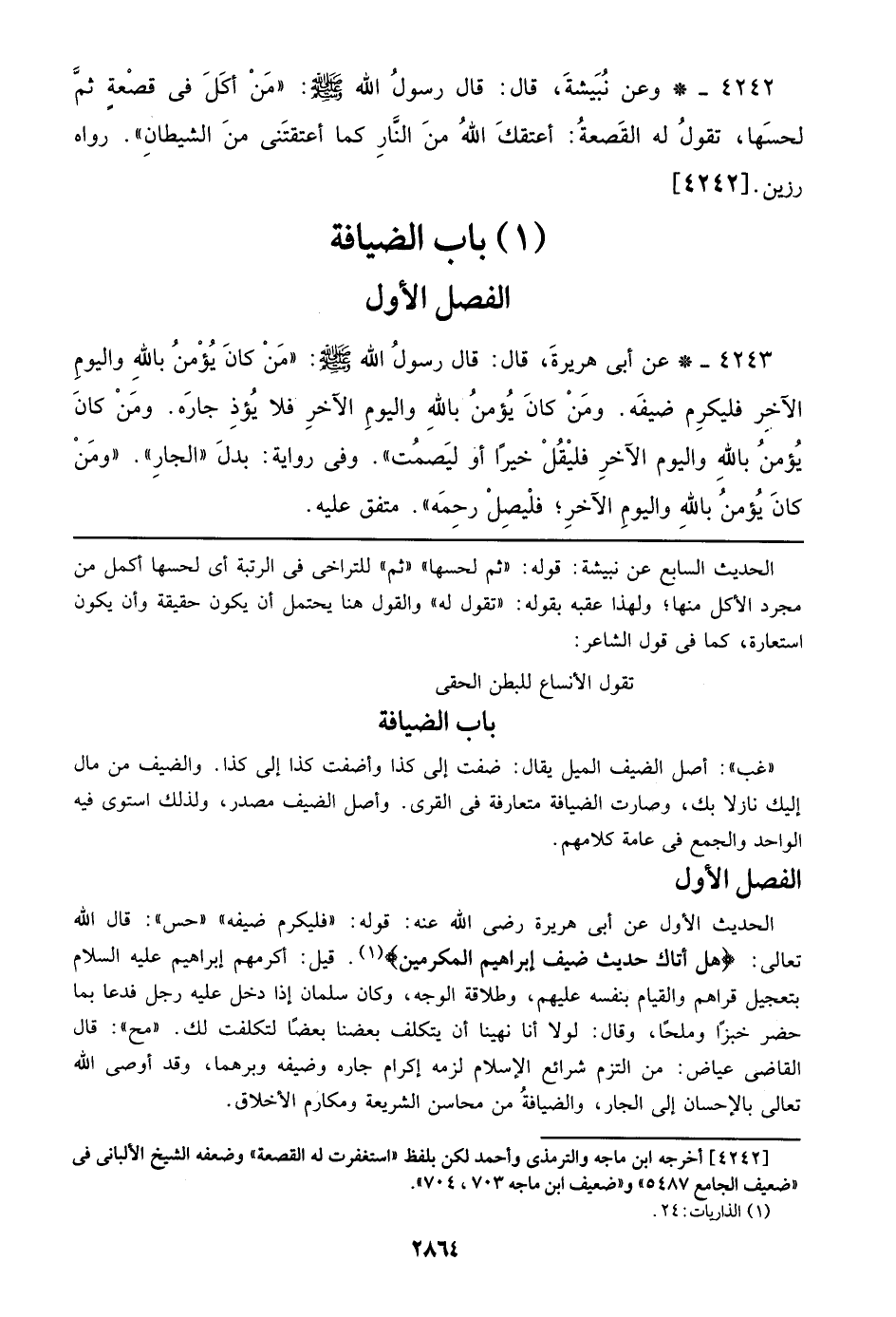 الحديث الأول عن أبي هريرة رضي الله عنه: قوله: ((فليكرم ضيفه)) ((حس)): قال الله تعالى: {هَلْ أَتَاكَ حَدِيثُ ضَيْفِ إبْرَاهِيمَ المُكْرَمِينَ}. قيل: أكرمهم إبراهيم عليه السلام بتعجيل قراهم والقيام بنفسه عليهم، وطلاقة الوجه، وكان سلمان إذا دخل عليه رجل فدعا بما حضر خبزا وملحا، وقال: لولا أنا نهينا أن يتكلف بعضنا بعضا لتكلفت لك. ((مح)): قال القاضي عياض: من التزم شرائع الإسلام لزمه إكرام جاره وضيفه وبرهما، وقد أوصى الله تعالى بالإحسان إلى الجار، والضيافة من محاسن الشريعة ومكارم الأخلاق.
