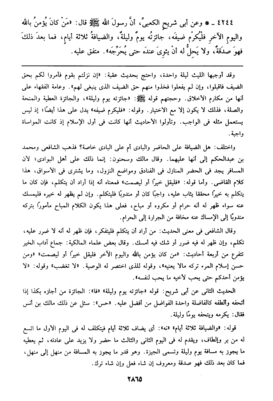 4244 - وعن أبي شريح الكعبي، أن رسول الله صلى الله عليه وسلم قال: ((من كان يؤمن بالله واليوم الآخر فليكرم ضيفه، جائزته يوم وليلة، والضيافة ثلاثة أيام، فما بعد ذلك فهو صدقة، ولا يحل له أن يثوى عنده حتى يحرجه)). متفق عليه.