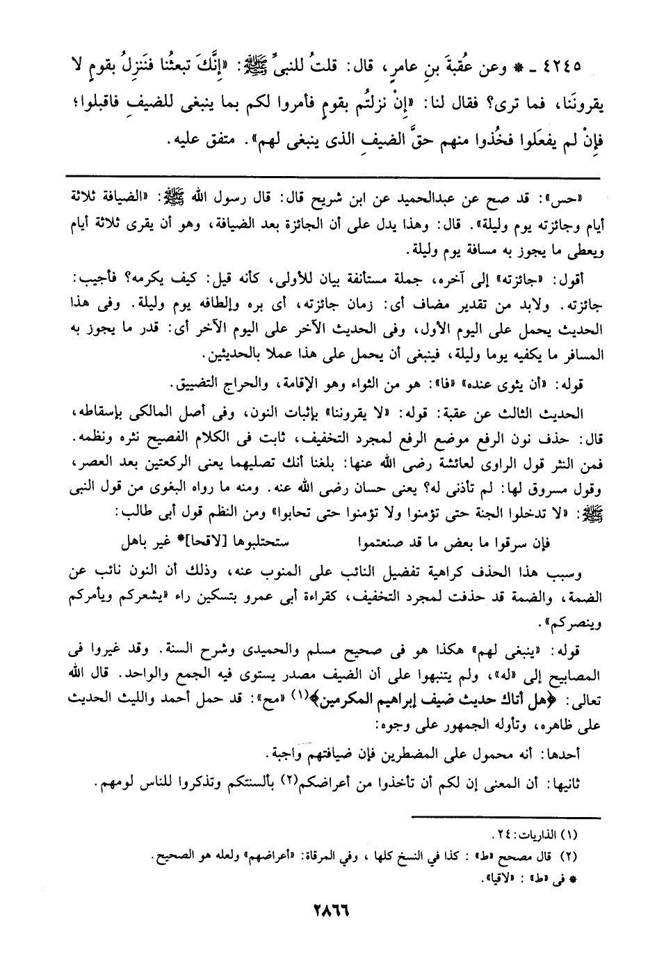 قوله: ((ينبغي لهم)) هكذا هو في صحيح مسلم والحميدي وشرح السنة. وقد غيروا في المصابيح إلى ((له))، ولم ينتبهوا على أن الضيف مصدر يستوي فيه الجمع والواحد. قال الله تعالى: {هَلْ أَتَاكَ حَدِيثُ ضَيْفِ إبْرَاهِيمَ المُكْرَمِينَ} ((مح)): قد حمل أحمد والليث الحديث على ظاهره، وتأوله الجمهور على وجوه: