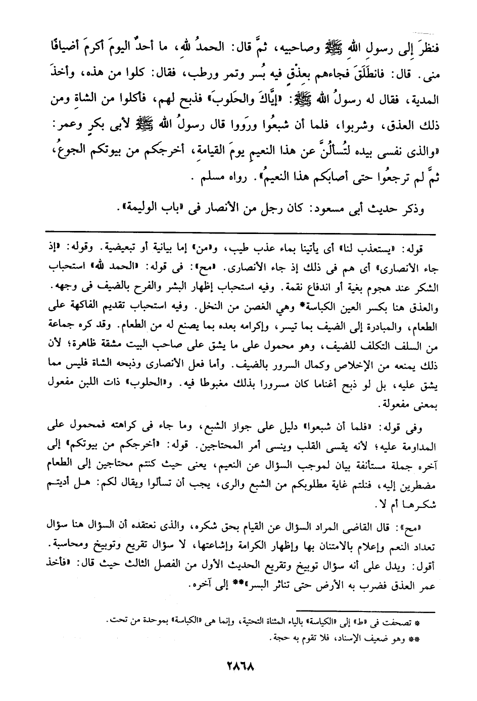 فنظر إلى رسول الله صلى الله عليه وسلم وصاحبيه، ثم قال: الحمد لله، ما أحد اليوم أكرم أضيافا مني. قال: فانطلق فجاءهم بعذق فيه بسر وتمر ورطب، فقال: كلوا من هذه، وأخذ المدية، فقال له رسول الله صلى الله عليه وسلم: ((إياك والحلوب)) فذبح لهم، فأكلوا من الشاة ومن ذلك العذق، وشربوا، فلما أن شبعوا ورووا قال رسول الله صلى الله عليه وسلم لأبي بكر وعمر: ((والذي نفسي بيده لتسألن عن هذا النعيم يوم القيامة، أخرجكم من بيوتكم الجوع، ثم لم ترجعوا حتى أصابكم هذا النعيم)). رواه مسلم.