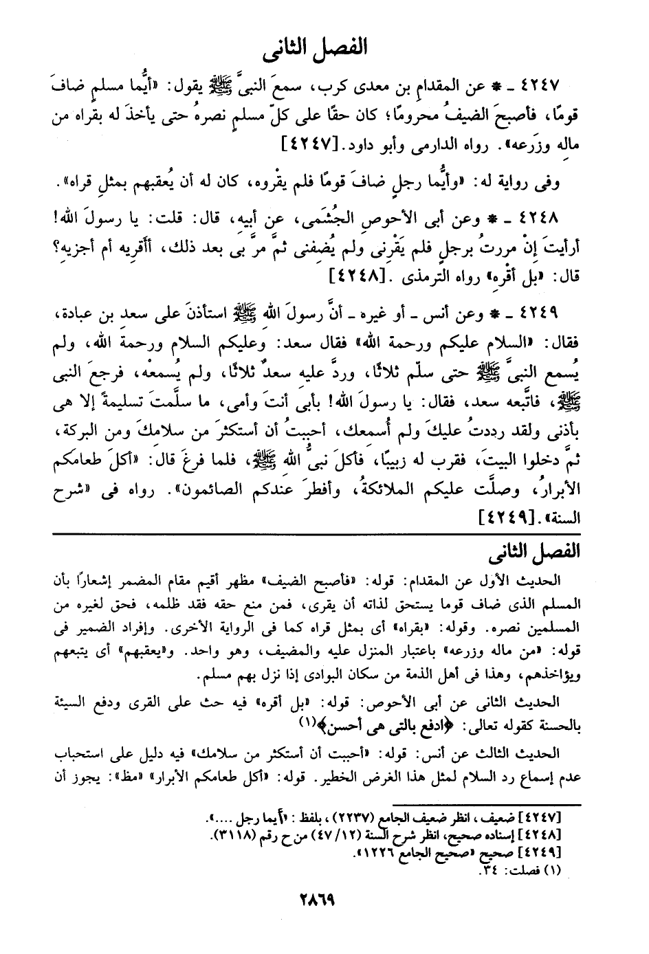 الحديث الأول عن المقدام: قوله: ((فأصبح الضيف)) مظهر أقيم مقام المضمر إشعارا بأن المسلم الذي ضاف قوما يستحق لذاته أن يقرى، فمن منع حقه فقد ظلمه، فحق لغيره من المسلمين نصره. وقوله: ((بقراه)) أي بمثل قراه كما في الرواية الأخرى. وإفراد الضمير في قوله: ((من ماله وزرعه)) باعتبار المنزل عليه والمضيف، وهو واحد. و ((يعقبهم)) أي يتبعهم ويؤاخذهم، وهذا في أهل الذمة من سكان البوادي إذا نول بهم مسلم.