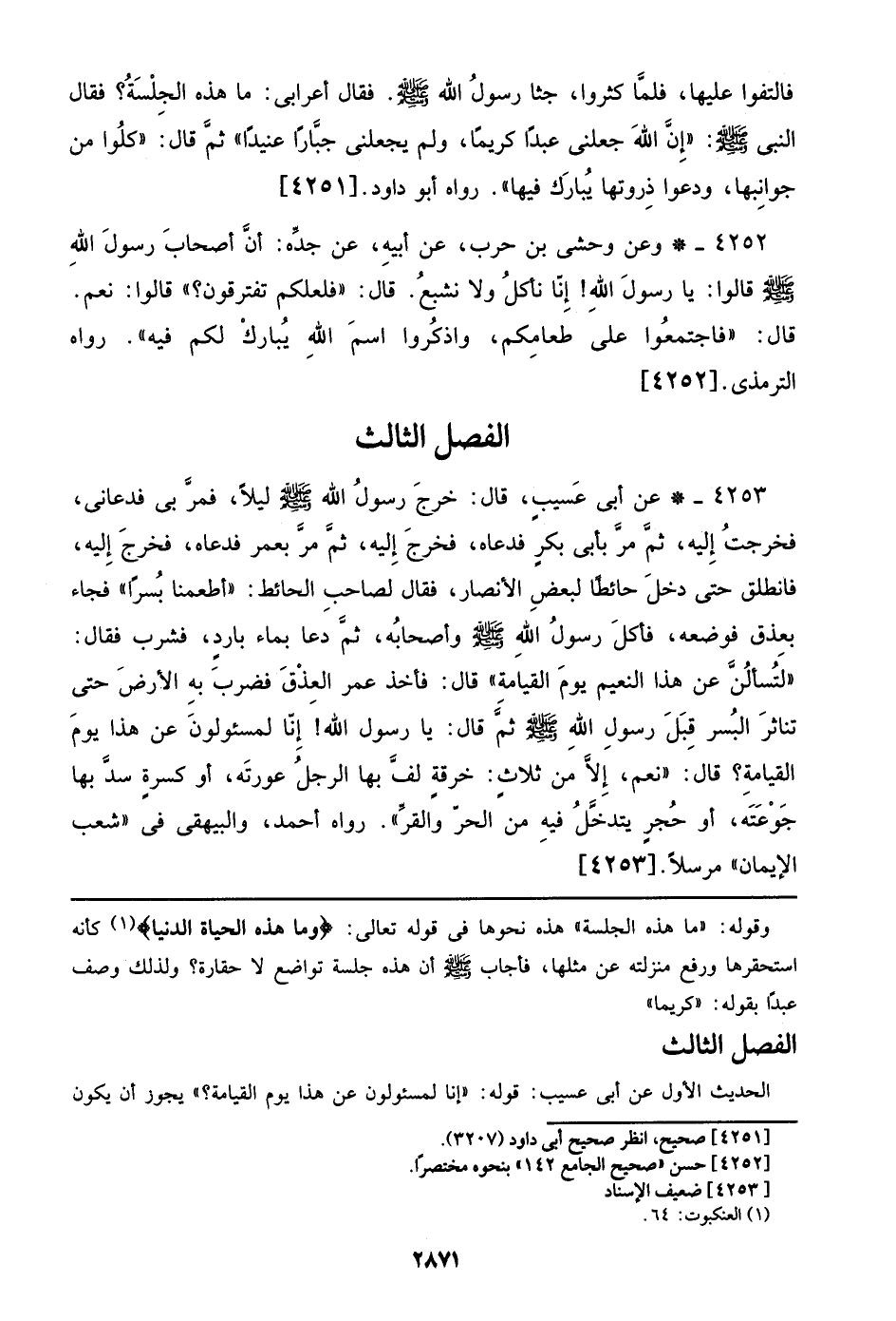 4253 - عن أبي عسيب، قال: خرج رسول الله صلى الله عليه وسلم ليلا، فمر بي فدعاني، فخرجت إليه، ثم مر بأبي بكر بدعاه، فخرج إليه، ثم مر بعمر فدعاه، فخرج إليه، فانطلق حتى دخل حائطا لبعض الأنصار، فقال لصاحب الحائط: ((أطعمنا بسرا)) فجاء بعذق فوضعه، فأكل رسول الله صلى الله عليه وسلم وأصحابه، ثم دعا بماء بارد، فشرب فقال: ((لتسألن عن هذا النعيم يوم القيامة)) قال: فأخذ عمر العذق فضرب به الأرض حتى تناثر البسر قبل رسول الله صلى الله عليه وسلم ثم قال: يا رسول الله! إنا لمسئولون عن هذا يوم القيامة؟ قال: ((نعم، إلا من ثلاث: خرقة لف بها الرجل عورته، أو كسرة سد بها جوعته، أو حجر يتدخل فيه من الحر والقر)). رواه أحمد، والبيهقي في ((شعب الإيمان)) مرسلا. [4253]