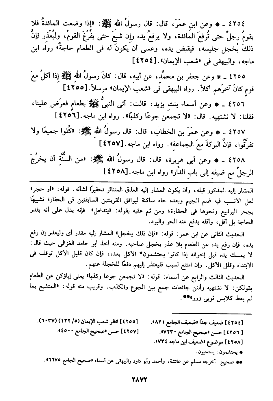 4255 - وعن جعفر بن محمد، عن أبيه، قال: كان رسول الله صلى الله عليه وسلم إذا أكل مع قوم كان آخرهم أكلا. رواه البيهقي في ((شعب الإيمان)) مرسلا. [4255]