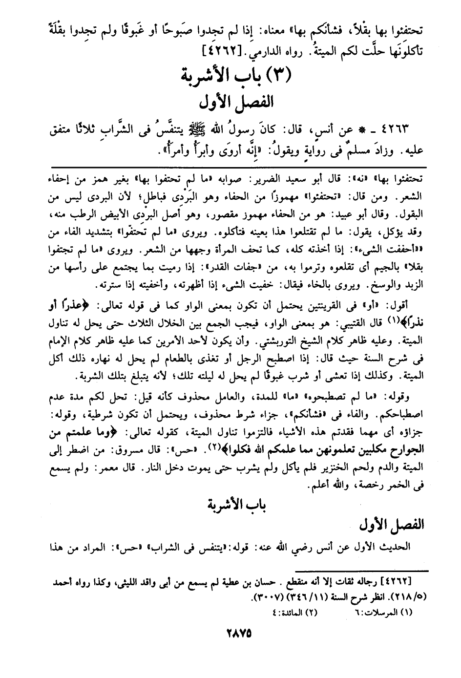 4263 - عن أنس، قال: كان رسول الله صلى الله عليه وسلم يتنفس في الشراب ثلاثاً متفق عليه. وزاد مسلم في رواية ويقول: ((إنه أروى وأبرأ وأمرأ)).