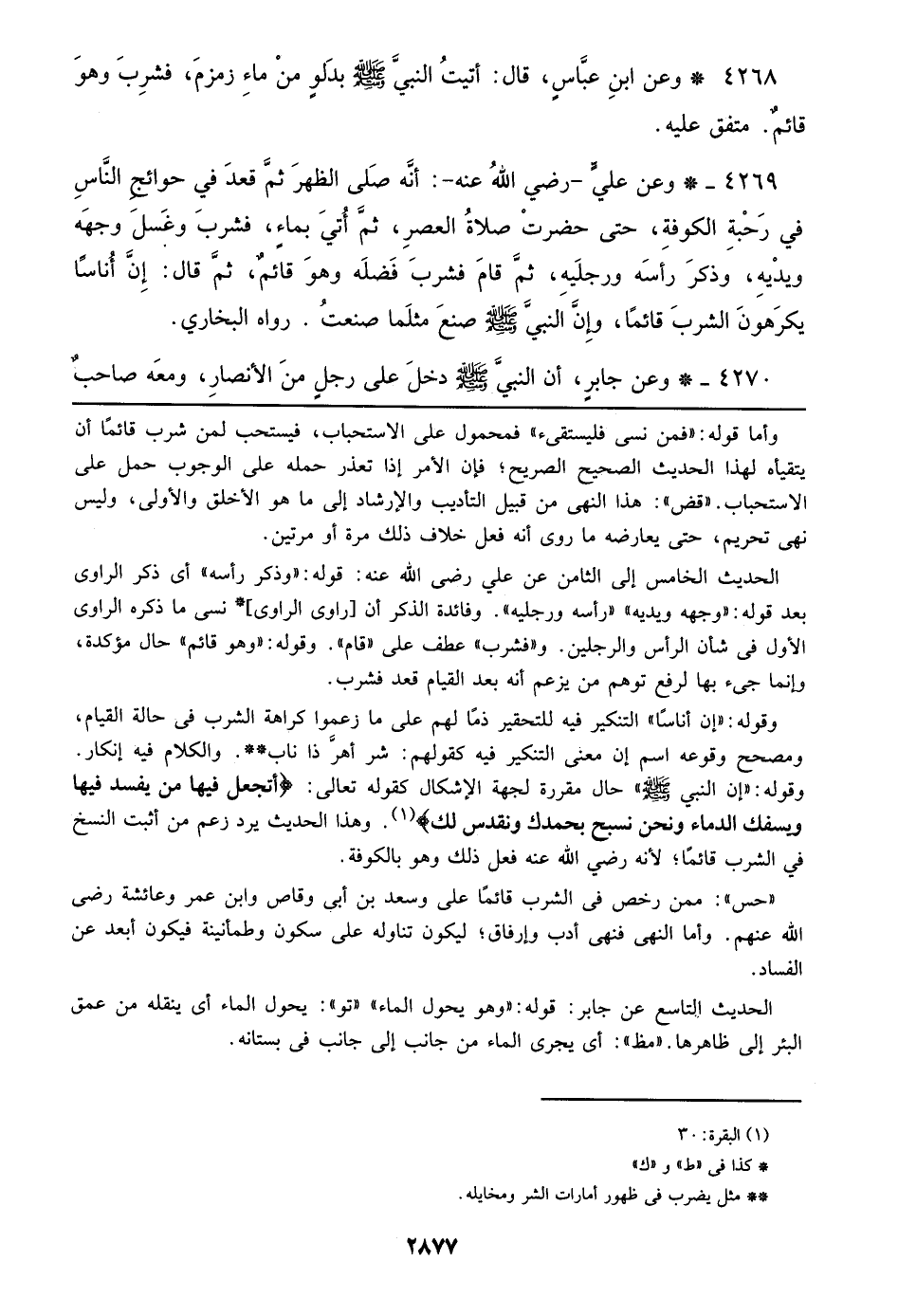 4268 _ * وعن ابن عباس، قال: أتيت النبي صلى الله عليه وسلم بدلو من ماء زمزم، فشرب وهو قائم. متفق عليه.