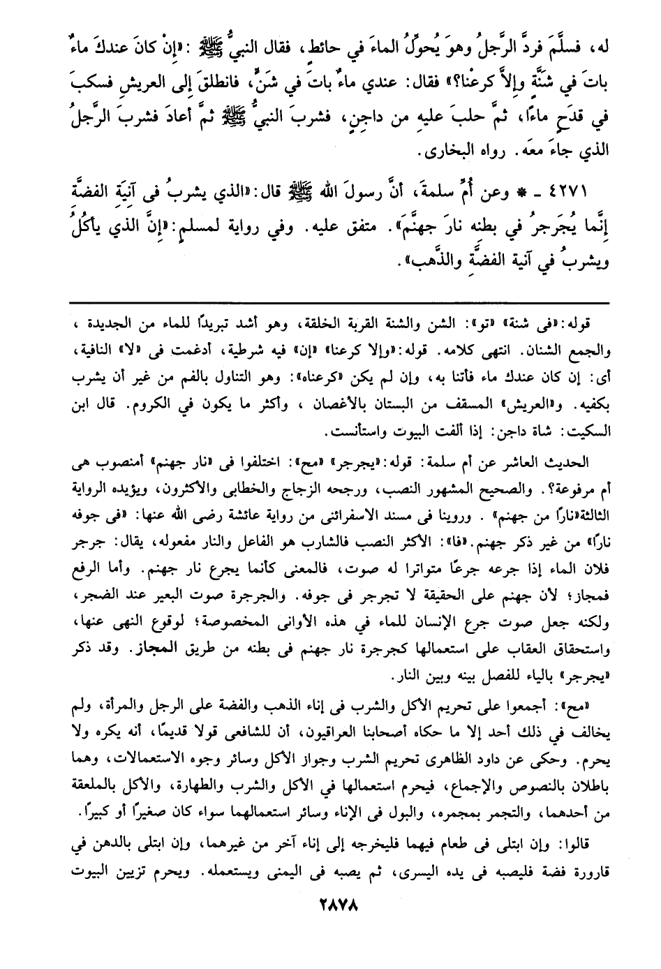4271 - وعن أم سلمة، أن رسول الله صلى الله عليه وسلم قال: ((الذي يشرب في آنية الفضة إنما يجرجر في بطنه نار جهنم)). متفق عليه. وفي رواية لمسلم: ((إن الذي يأكل ويشرب في آنية الفضة والذهب)).
