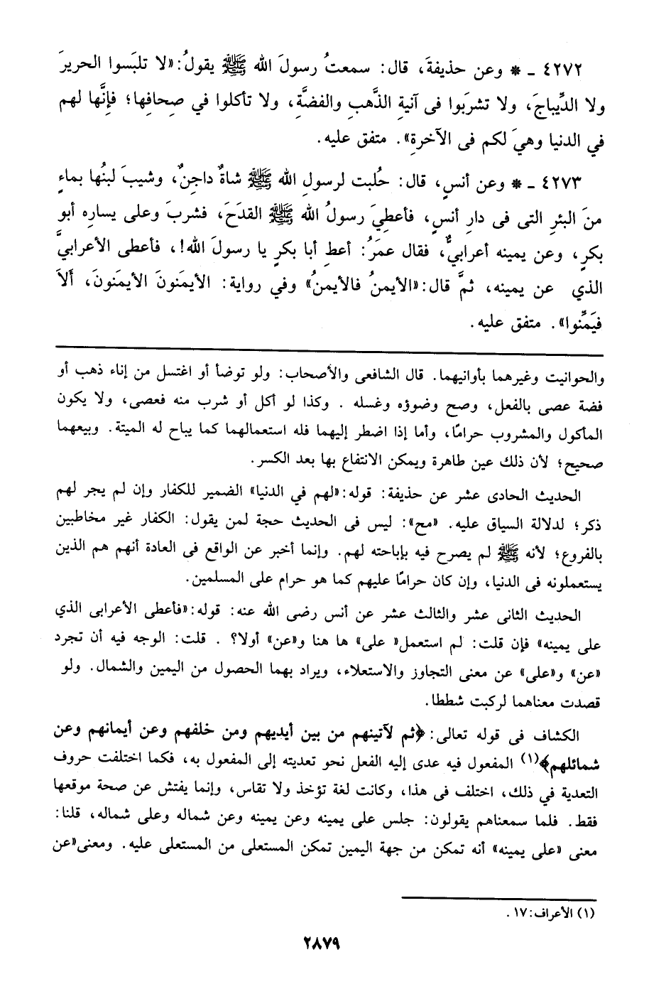 الحديث الثاني عشر والثالث عشر عن أنس رضي الله عنه: قوله: ((فأعطى الأعرابي الذي على يمينه)) فإن قالت: لم استعمل ((على)) ها هنا و ((عن)) أولا؟. قلت: الوجه فيه أن تجرد ((عن)) و ((على)) عن معنى التجاوز والاستعلاء، ويراد بهما الحصول من اليمين والشمال. ولو قصدت معناهما لركبت شططا.