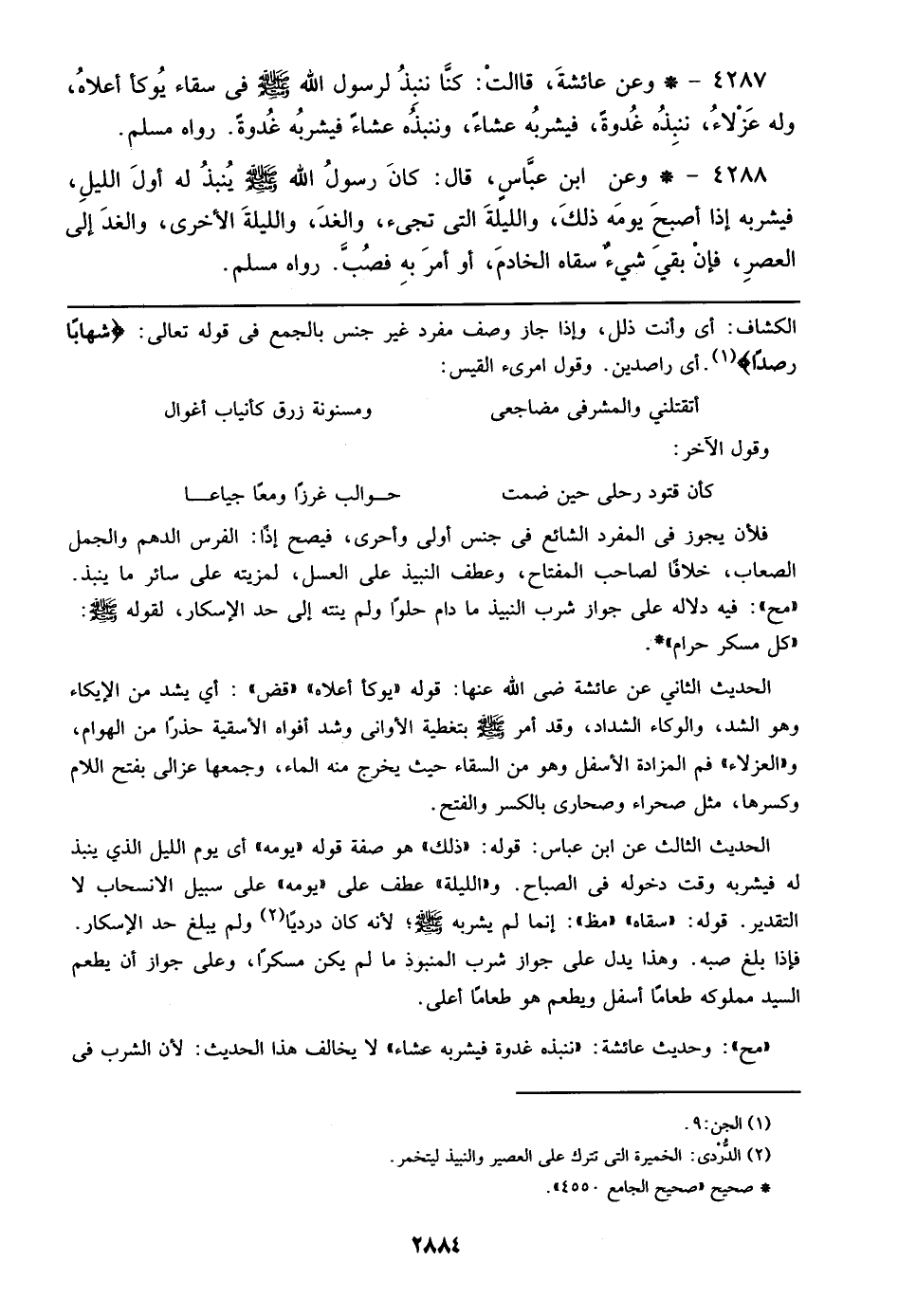 4288 - وعن ابن عباس، قال: كان رسول الله صلى الله عليه وسلم ينبذ له أول الليل، فيشربه إذا أصبح يومه ذلك، والليلة التي تجيء، والغد، والليلة التي تجيء، والغد، والليلة الأخرى، والغد إلى العصر، فإن بقي شيء سقاه الخادم، أو أمر به فصب. رواه مسلم.