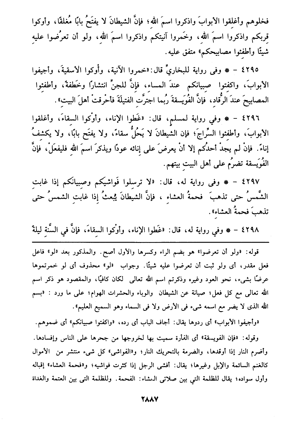 وقوله: ((فإن الفويسقة)) أي الفأرة سميت بها لخروجها من جحرها على الناس وإفسادها. وأضرم النار إذا أوقدها، والضرمة بالتحريك النار؛ و ((الفواشي)) كل شيء منتشر من الأموال كالغنم السائمة والإبل وغيرها؛ يقال: أفشى الرجل إذا كثرت فواشيه؛ و ((فحمة العشاء)) إقباله وأول سواده؛ يقال للظلمة التي بين صلاتي العشاء: الفحمة. وللظلمة التي بين العتمة والغداة