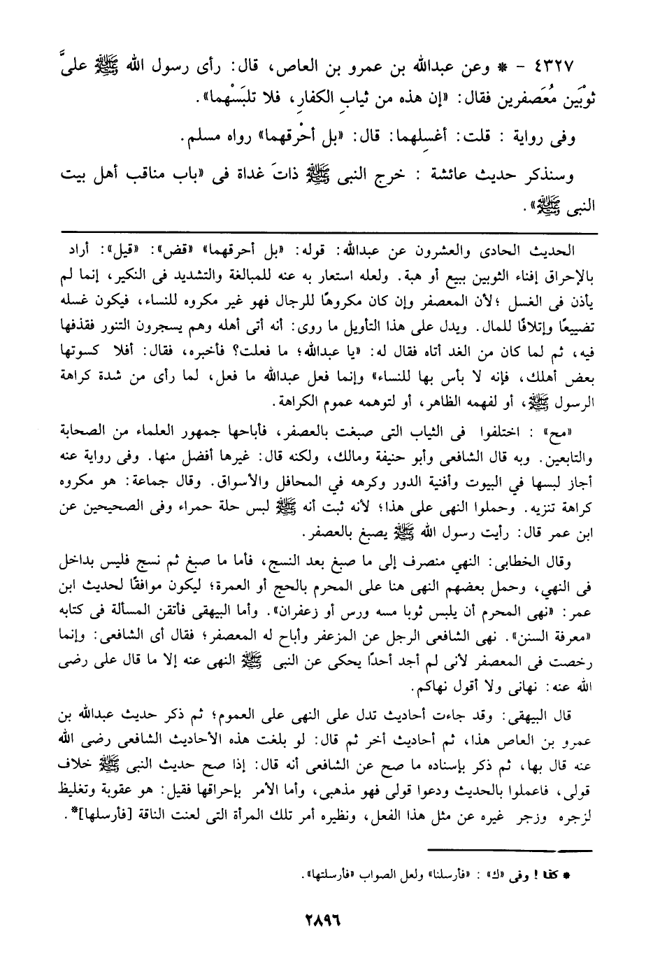 وقال الخطابي: النهي منصرف إلى ما صبغ بعد النسج، فأما ما صبغ ثم نسج فليس بداخل في النهي، وحمل بعضهم النهي هنا على المحرم بالحج أو العمرة؛ ليكون موافقاً لحديث ابن عمر: ((نهى المحرم أن يلبس ثوبا مسه ورس أو زعفران)). وأما البيهقي فأتقن المسألة في كتابه ((معرفة السنن)). نهى الشافعي الرجل عن المزعفر وأباح له المعصفر؛ فقال أي الشافعي: وإنما رخصت في المعصفر لأني لم أجد أحداً يحكى عن النبي صلى الله عليه وسلم النهي عنه إلا ما قال علي رضي الله عنه: نهاني ولا أقول نهاكم.