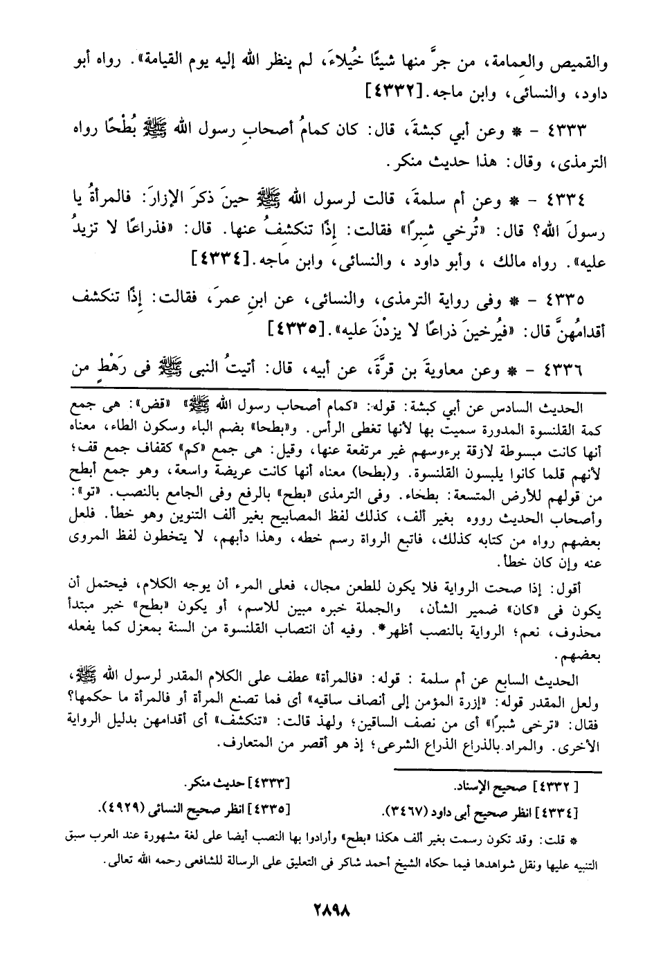 4334 - وعن أم سلمة، قالت لرسول الله صلى الله عليه وسلم حين ذكر الإزار: فالمرأة يا رسول الله؟ قال: ((ترخي شبراً)) فقالت: إذا تنكشف عنها. قال: ((فذراعاً لا تزيد عليه)). رواه مالك، وأبو داود، والنسائي، وابن ماجه. [4334]