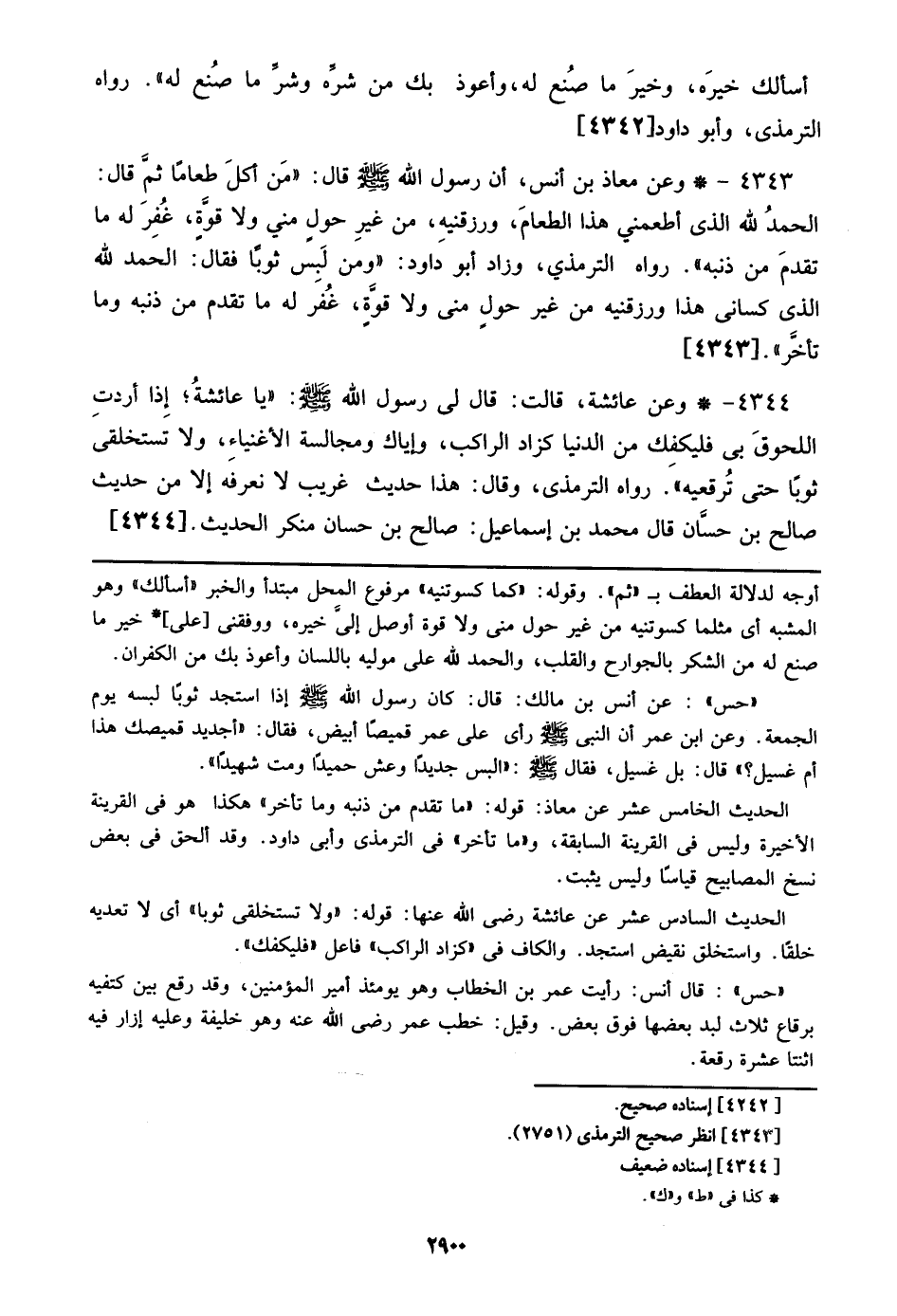 4343 - وعن معاذ بن أنس، أن رسول الله صلى الله عليه وسلم قال: ((من أكل طعاماً ثم قال: الحمد لله الذي أطعمني هذا الطعام، ورزقنيه، من غير حول مني ولا قوة، غفر له ما تقدم من ذنبه)). رواه الترمذي، وزاد أبو داود: ((ومن لبس ثوباً فقال: الحمد لله الذي كساني هذا ورزقنيه من غير حول مني ولا قوة، غفر له ما تقدم من ذنبه وما تأخر)). [4343]