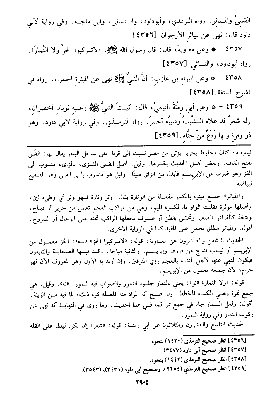 4357 - وعن معاوية، قال: قال رسول الله صلى الله عليه وسلم: ((لا تركبوا الخز ولا النمار)). رواه أبو داود، والنسائي. [4357]
