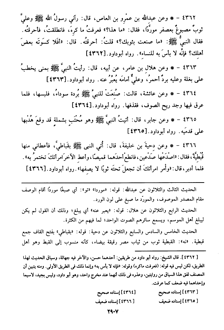 4362 - وعن عبد الله بن عمرو بن العاص، قال: رآني رسول الله صلى الله عليه وسلم وعلي ثوب مصبوغ بعصفر مورداً، فقال: ((ما هذا؟)) فعرفت ما كره، فانطلقت، فأحرقته. فقال النبي صلى الله عليه وسلم: ((ما صنعت بثوبك؟)) قلت: أحرقته. قال: ((أفلا كسوته بعض أهلك؟ فإنه لا بأس به للنساء)). رواه أبو داود. [4362]