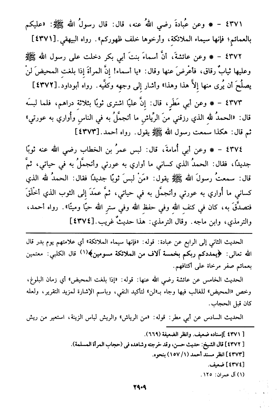 4371 - وعن عبادة رضي الله عنه، قال: قال رسول الله صلى الله عليه وسلم: ((عليكم بالعمائم؛ فإنها سيماء الملائكة، وأرخوها خلف ظهوركم)). رواه البيهقي. [4371]