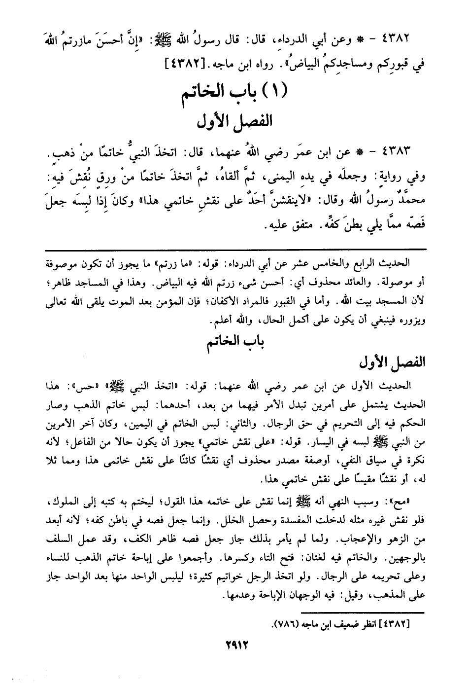 4383 - عن ابن عمر رضي الله عنهما، قال: اتخذ النبي خاتماً من ذهب. وفي رواية: وجعله في يده اليمنى، ثم ألقاه، ثم اتخذ خاتماً من ورق نقش فيه: محمد رسول الله وقال: ((لا ينقشن أحد على نقش خاتمي هذا)) وكان إذا لبسه جعل فصه مما يلي بظن كفه. متفق عليه.