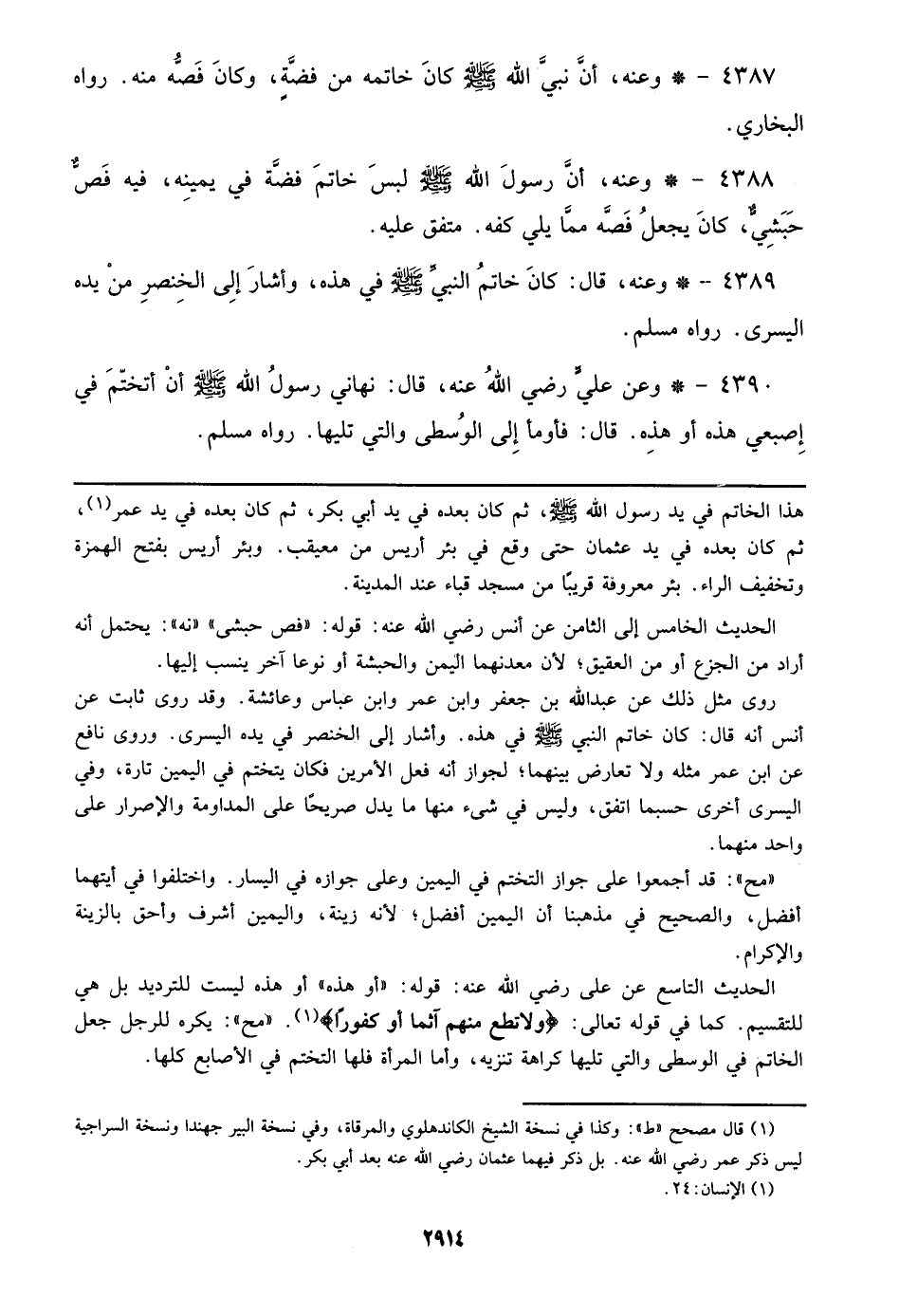 4388 - وعنه، أن رسول الله صلى الله عليه وسلم لبس فضة في يمينه، فيه فص حبشي، كان يجعل فصه مما يلي كفه. متفق عليه.