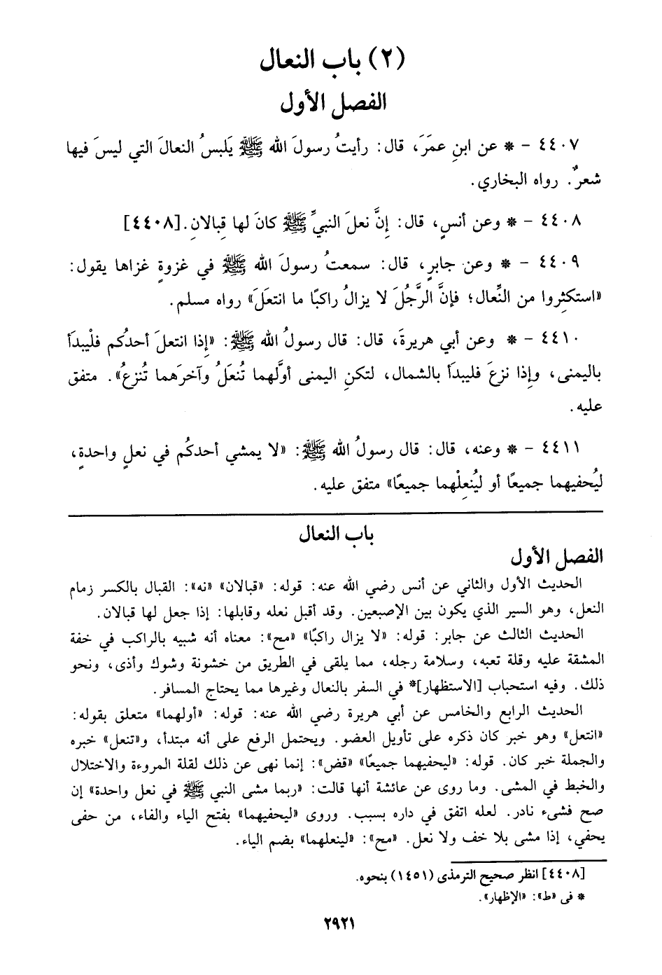 الحديث الرابع والخامس عن أبي هريرة رضي الله عنه: قوله: ((أولهما)) متعلق بقوله: ((انتعل)) وهو خبر كان ذكره على تأويل العضو. ويحتمل الرفع على أنه مبتدأ، و ((تنعل)) خبره والجملة خبر كان. قوله: ((ليحفيهما جميعاً)) ((قض)): إنما نهى عن ذلك لقلة المروءة والاختلال والخبط في المشي. وما روى عن عائشة أنها قالت: ((ربما مشي النبي صلى الله عليه وسلم في نعل واحدة)) إن صح فشئ نادر. لعله اتفق في داره بسبب. وروى ((ليحفيهما)) بفتح الياء والفاء، من حفي يحفي، إذا مشي بلا خف ولا نعل. ((مح)): ((لينعلهما)) بضم الياء.
