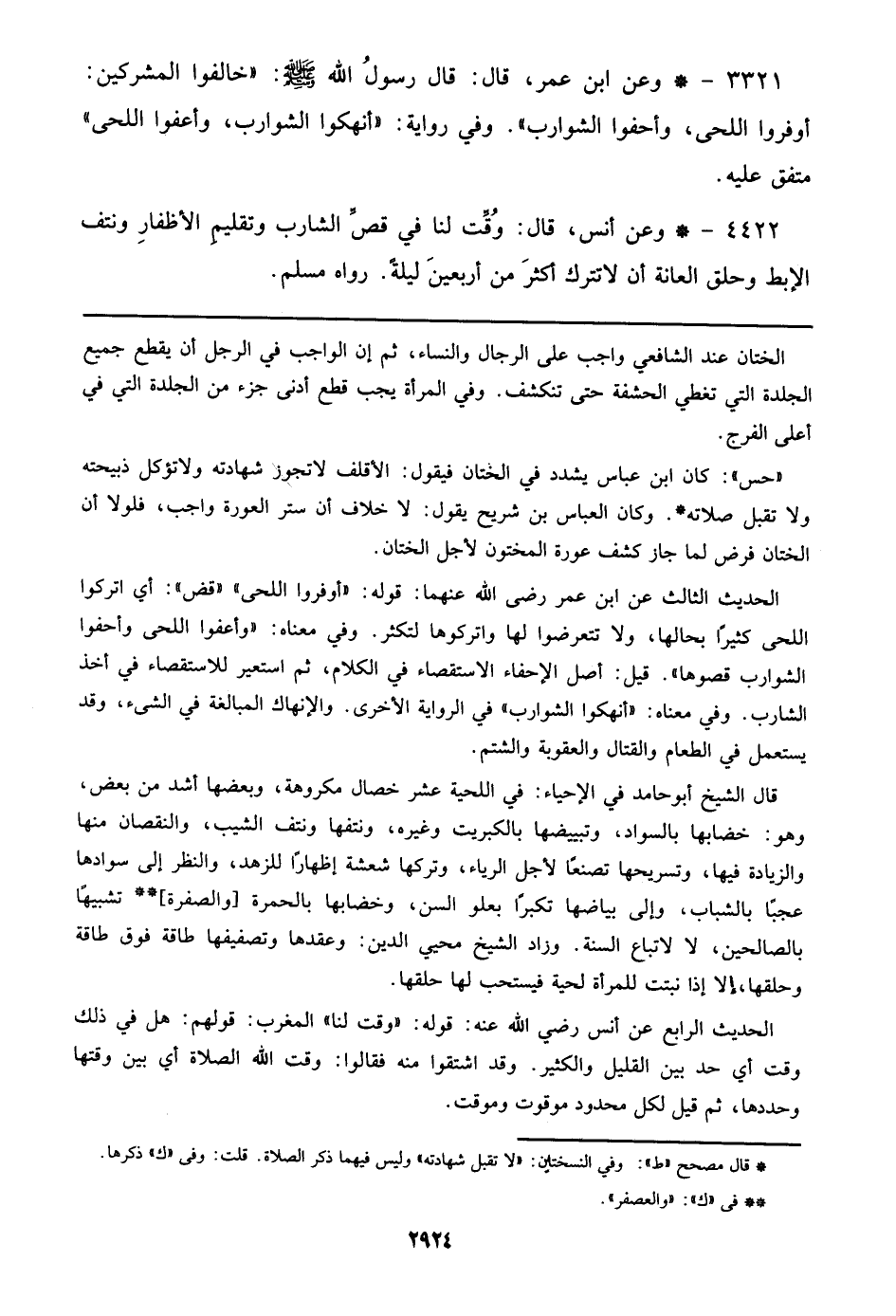 الحديث الثالث عن ابن عمر رضي الله عنهما: قوله: ((أوفروا اللحى)) ((قض)): أي اتركوا اللحى كثيراً بحالها، ولا تتعرضوا لها واتركوها لتكثر. وفي معناه: ((وأعفوا اللحى وأحفوا الشوارب قصوها)). قيل: أصل الإحفاء الاستقصاء في الكلام، ثم استعير للاستقصاء في أخذ الشارب. وفي معناه: ((أنهكوا الشوارب)) في الرواية الأخرى. والإنهاك المبالغة في الشيء، وقد يستعمل في الطعام والقتال والعقوبة والشتم.