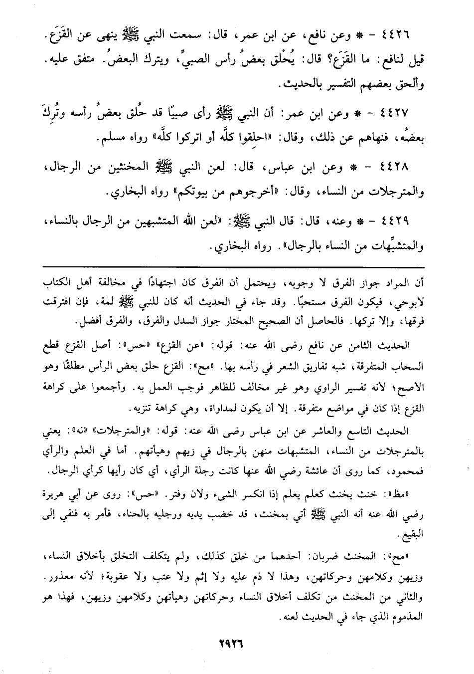 4426 - وعن نافع، عن ابن عمر، قال: سمعت النبي صلى الله عليه وسلم ينهي عن القزع. قيل لنافع: ما القزع؟ قال: يحلق بعض رأس الصبي، ويترك البعض. متفق عليه. وألحق بعضهم التفسير بالحديث.