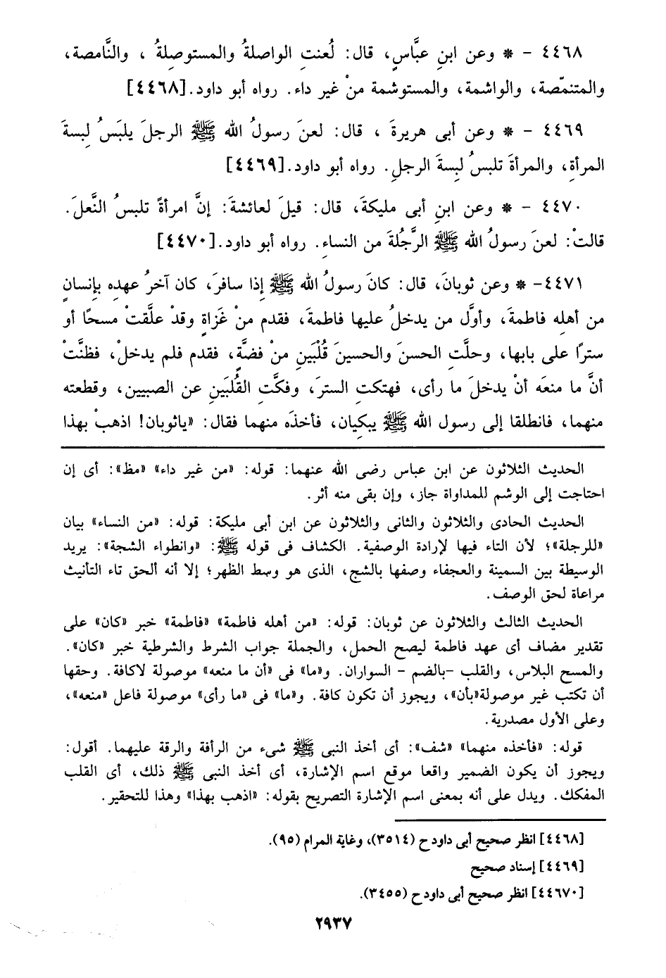 الحديث الثالث والثلاثون عن ثوبان: قوله: ((من أهله فاطمة)) ((فاطمة)) خبر ((كان)) على تقدير مضاف أي عهد فاطمة ليصح الحمل، والجملة جواب الشرط والشرطية خبر ((كان)). والمسح البلاس، والقلب – بالضم – السواران. و ((ما)) في ((أن ما منعه)) موصولة لاكافة. وحقها أن تكتب غير موصولة ((بأن))، ويجوز أن تكون كافة. و ((ما)) في ((ما رأي)) موصولة فاعل ((منعه))، وعلى الأول مصدرية.