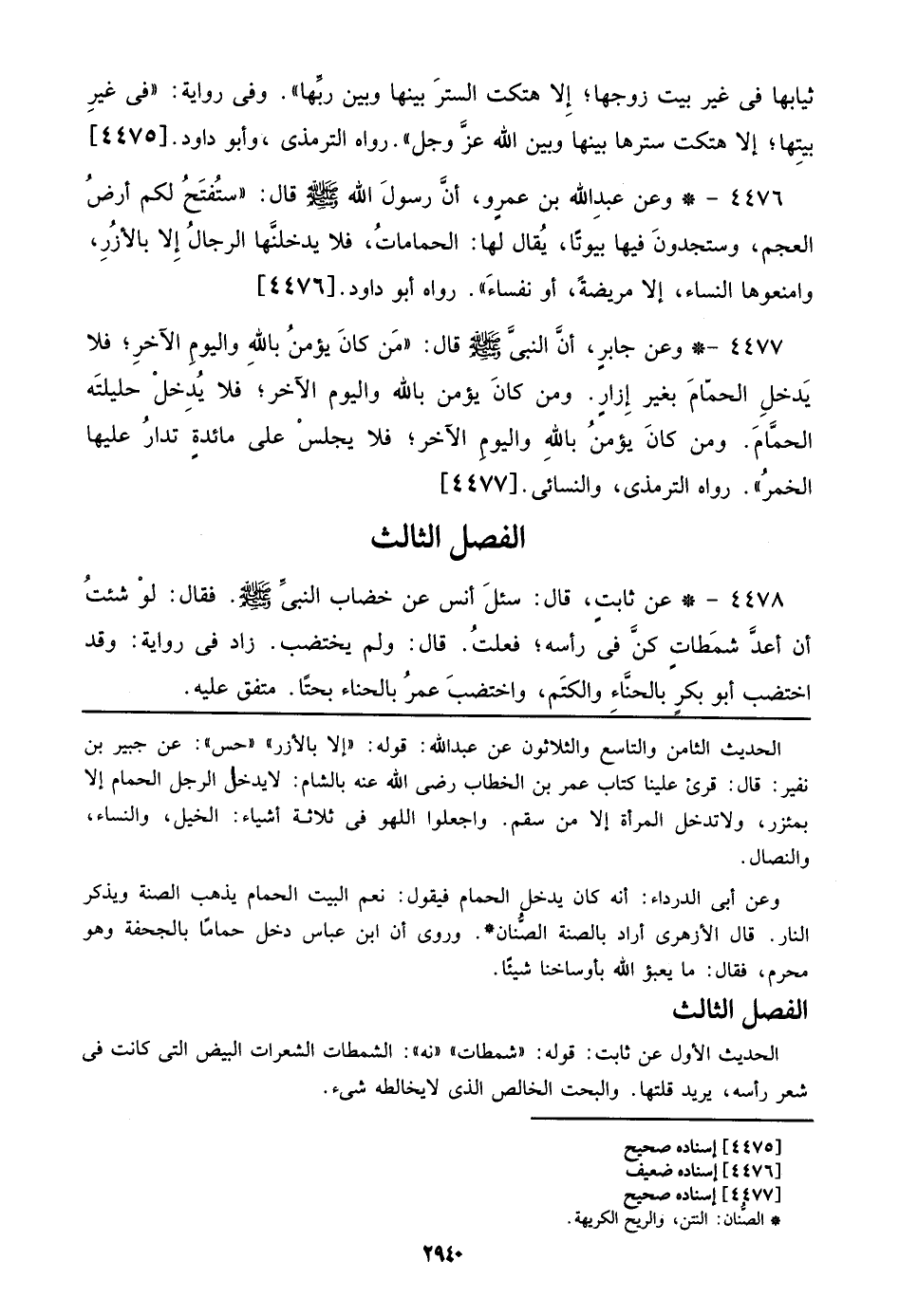 4476 - وعن عبد الله بن عمرو، أن رسول الله صلى الله عليه وسلم قال: ((ستفتح لكم أرض العجم، وستجدون فيها بيوتاً، يقال لها: الحمامات، فلا يدخلنها الرجال إلا بالأزر، وامنعوها النساء، إلا مريضة، أو نفساء)). رواه أبو داود. [4476]