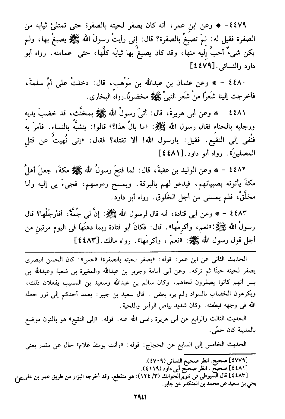 4479 - وعن ابن عمر، أنه كان يصفر لحيته بالصفرة حتى تمتلئ ثيابه من الصفرة فقيل له: لم تصبغ بالصفرة؟ قال: رأيت رسول الله صلى الله عليه وسلم يصبغ بها، ولم يكن شيء أحب إليه منها، وقد كان يصبغ بها ثيابه كلها، حتى عمامته. رواه أبو داود والنسائي. [4479]