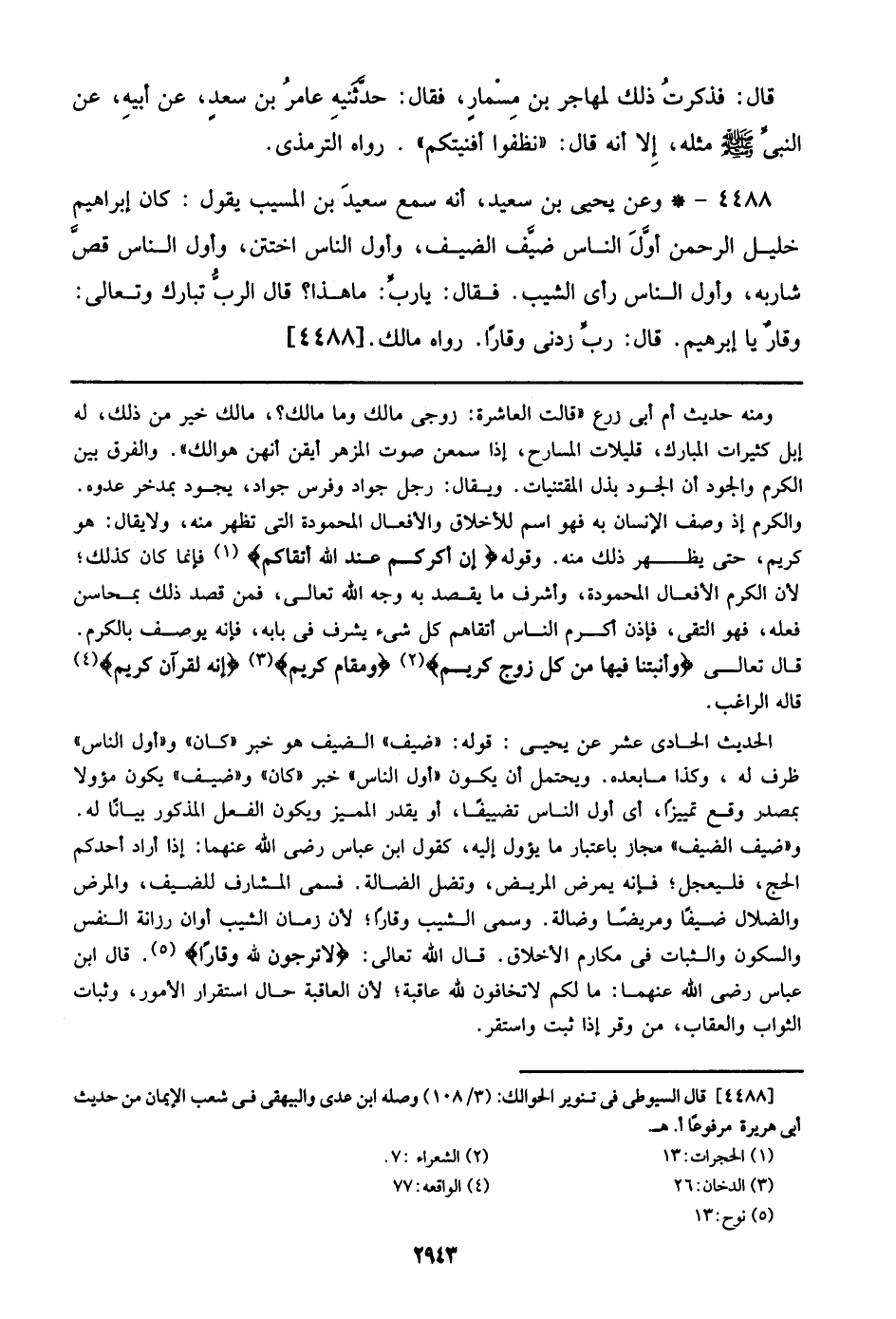 4488 - وعن يحيى بن سعيد، أنه سمع سعيد بن المسيب يقول: كان إبراهيم خليل الرحمن أول الناس ضيف الضيف، وأول الناس اختتن، وأول الناس قص شاربه، وأول الناس رأي الشيب. فقال: يا رب: ما هذا؟ قال الرب تبارك وتعالى: وقار يا إبراهيم. قال: رب زدني وقاراً. رواه مالك. [4488]
