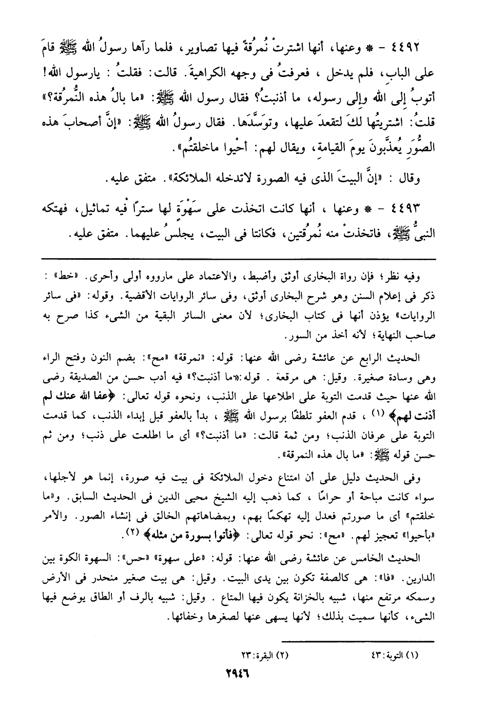 4493 - وعنها، أنها كانت اتخذت على سهوة لها ستراً فيه تماثيل، فهتكه النبي صلى الله عليه وسلم، فاتخذت منه نمرقتين، فكانتا في البيت، يجلس عليهما. متفق عليه.
