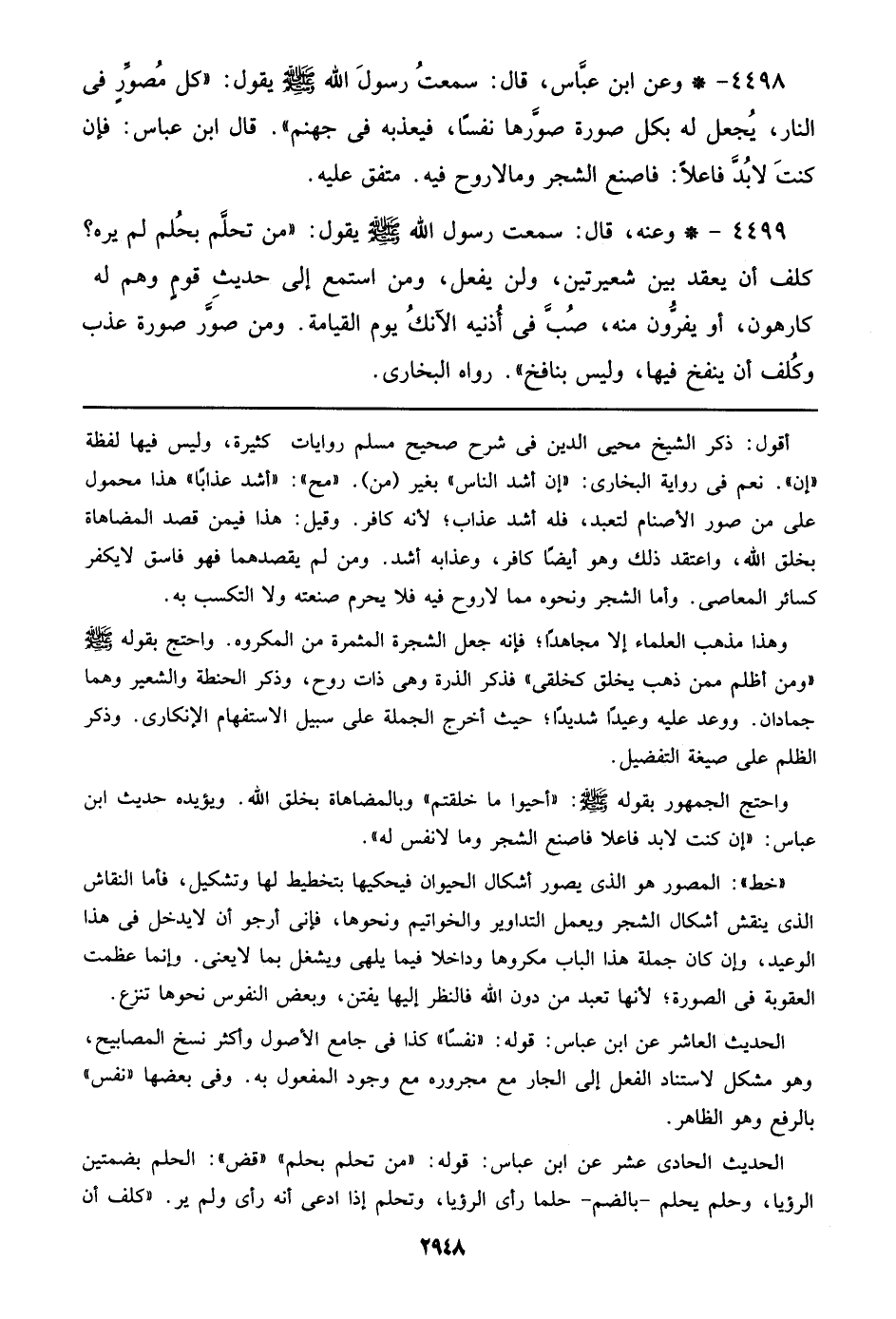 4498 - وعن ابن عباس، قال: سمعت رسول الله صلى الله عليه وسلم يقول: ((كل مصور في النار، يجعل له بكل صورة صورها نفساً، فيعذبه في جهنم)). قال ابن عباس: فإن كنت لابد فاعلاً: فاصنع الشجر وما لا روح فيه. متفق عليه.
