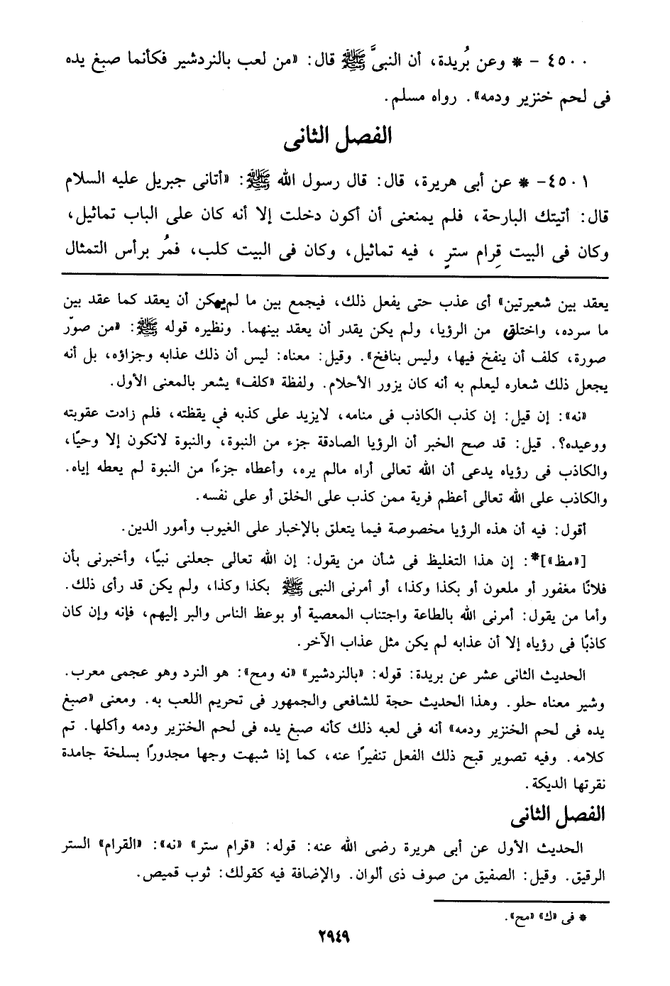 الحديث الثاني عشر عن بريدة: قوله: ((بالنردشير)) ((نه ومح)): هو النرد وهو عجمي معرب. وشير معناه حلو. وهذا الحديث حجة للشافعي والجمهور في تحريم اللعب به. ومعنى ((صبغ يده في لحم الخنزير ودمه)) أنه في لعبه ذلك كأنه صبغ يده في لحم الخنزير ودمه وأكلها. تم كلامه. وفيه تصوير قبح ذلك الفعل تنفيراً عنه، كما إذا شبهت وجها مجدوراً بسلخة جامدة نقرتها الديكة.