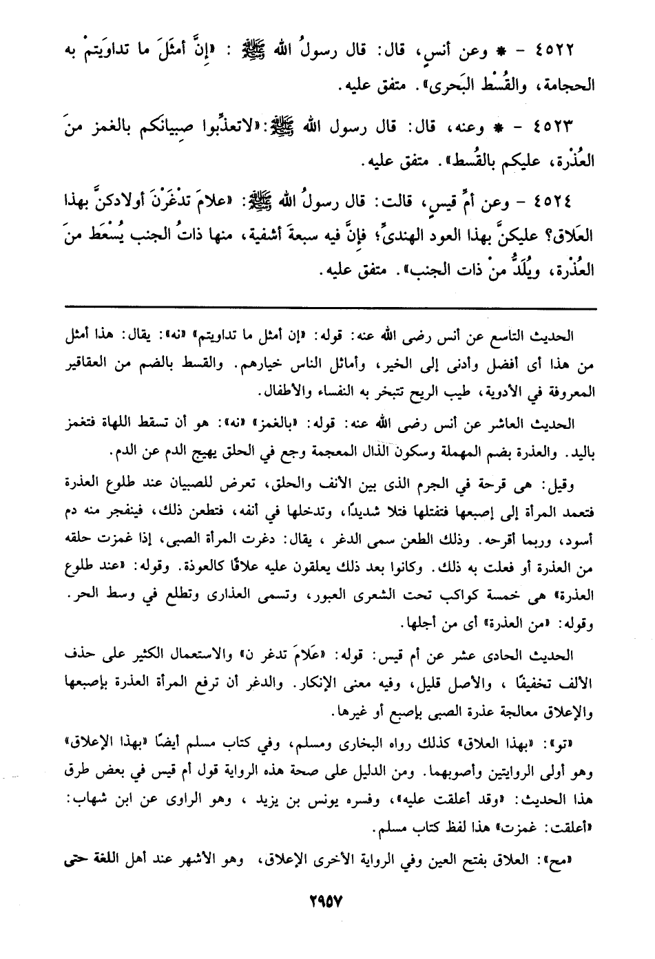 4524 - وعن أم قيس، قالت: قال رسول الله صلى الله عليه وسلم: ((علام تدغرن أولادكن بهذا العلاق؟ عليكن بهذا العود الهندي؛ فإن فيه سبعة أشفية، منها ذات الجنب يسعط من العذرة، ويلد من ذات الجنب)). متفق عليه.