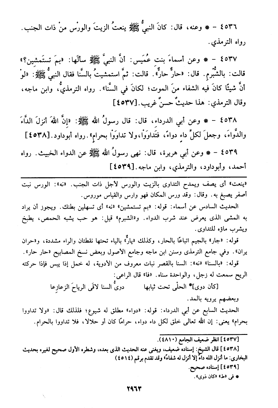 4537 - وعن أسماء بنت عميس: أن النبي صلى الله عليه وسلم سألها: ((بم تستمشين؟)) قالت: بالشبرم. قال: ((حار حار)). قالت: ثم استمشيت بالسنا فقال النبي صلى الله عليه وسلم: ((لو أن شيئاً كان فيه الشفاء من الموت؛ لكان في السنا)). رواه الترمذي، وابن ماجه، وقال الترمذي: هذا حديث حسن غريب. [4537]