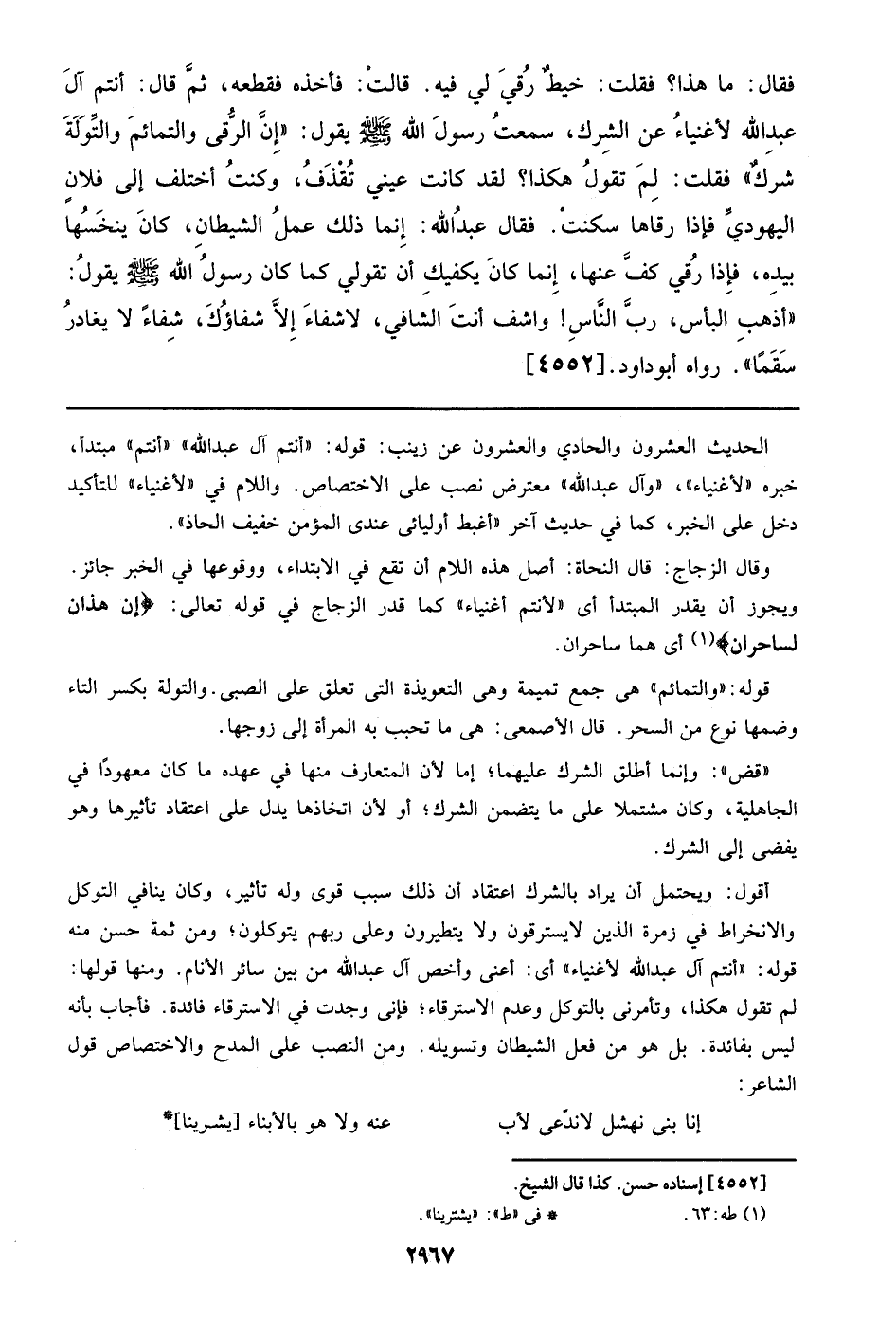 فقال: ما هذا؟ فقلت: خيط رقي لي فيه. قالت: فأخذه فقطعه، ثم قال: أنتم آل عبد الله لأغنياء عن الشرك، سمعت رسلو الله صلى الله عليه وسلم يقول: ((إن الرقي والتمائم والتولة شرك)) فقلت: لم تقول هكذا؟ لقد كانت عيني تقذف، وكنت أختلف إلى فلان اليهودي فإذا رقاها سكنت. فقال عبد الله: إنما ذلك عمل الشيطان، كان ينخسها بيده، فإذا رقي كف عنها، إنما كان يكفيك أن تقولي كما كان رسول الله صلى الله عليه وسلم يقول: ((اذهب البأس، رب الناس! واشف أنت الشافي، لا شفاء إلا شفاؤك، شفاء لا يغادر سقماً)). رواه أبو داود. [4552]