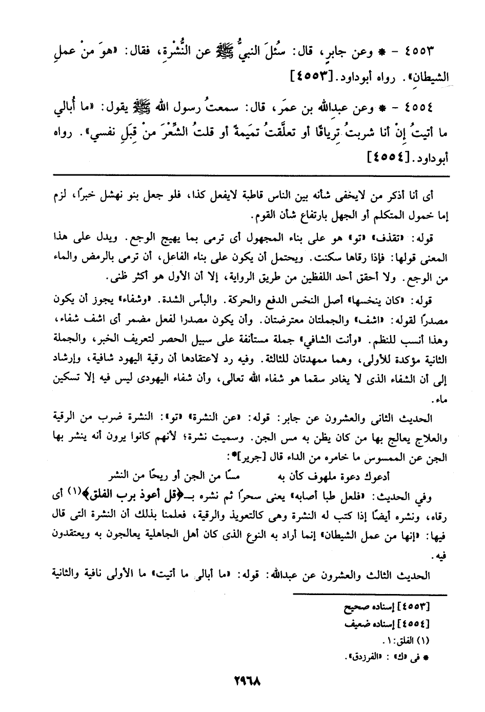 4553 - وعن جابر، قال: سئل النبي صلى الله عليه وسلم عن النشرة، فقال: ((هو من عمل الشيطان)). رواه أبو داود. [4553]