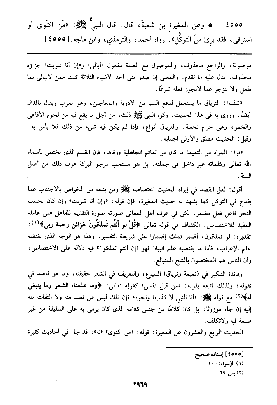 4555 - وعن المغيرة بن شعبة، قال: قال النبي صلى الله عليه وسلم: ((من اكتوى أو استرقي، فقد برئ من التوكل)). رواه أحمد، والترمذي، وابن ماجه. [4555]
