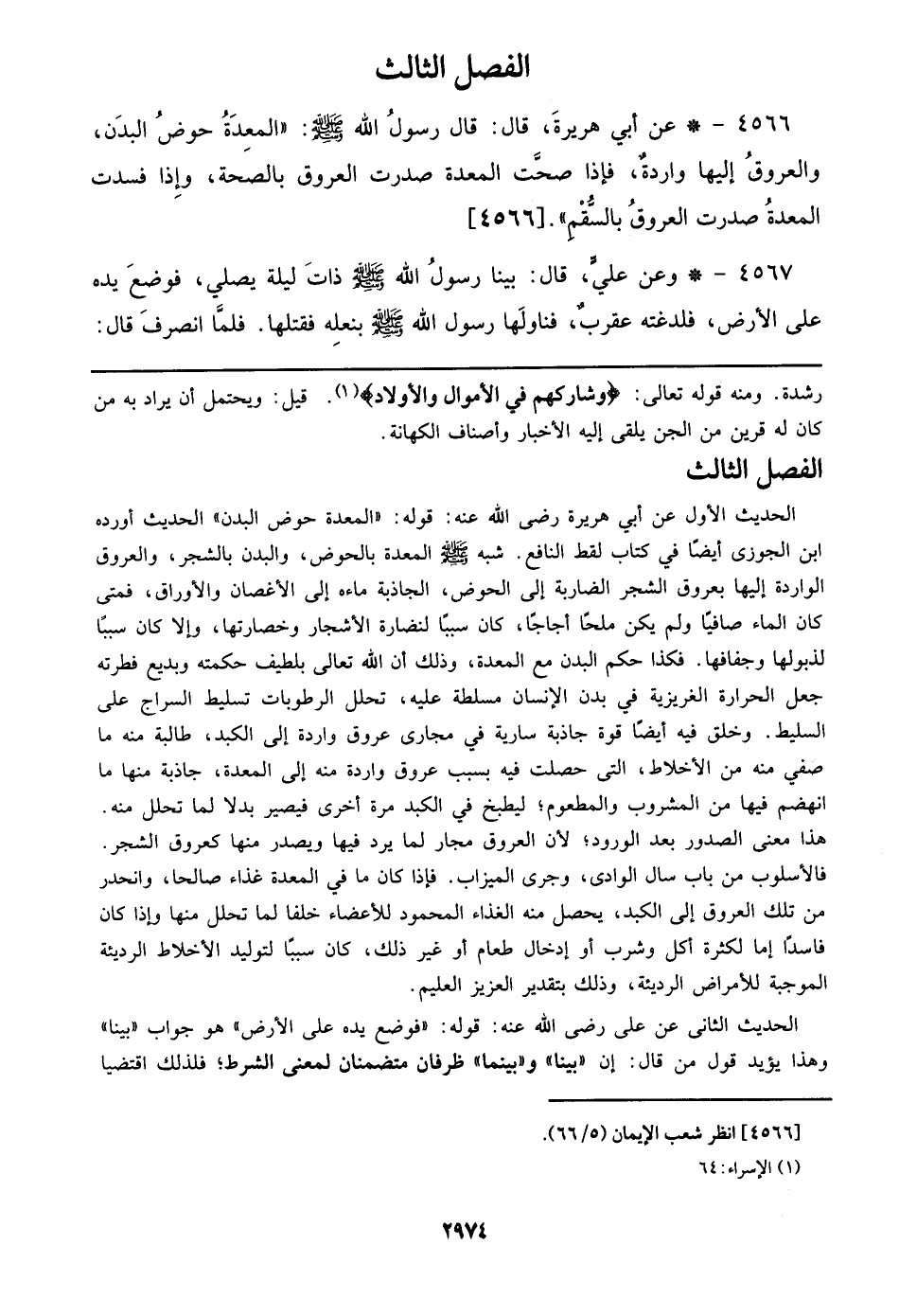 الحديث الأول عن أبي هريرة رضي الله عنه: قوله: ((المعدة حوض البدن)) الحديث أورده ابن الجوزي أيضاً في كتاب لقط النافع. شبه صلى الله عليه وسلم المعدة بالحوض، والبدن بالشجر، والعروق الواردة إليها بعروق الشجر الضاربة إلى الحوض، الجاذبة ماءه إلى الأغصان والأوراق، فمتى كان الماء صافياً ولم يكن ملحاً أجاجاً، كان سبباً لنضارة الأشجار وخصارتها، وإلا كان سبباً لذبولها وجفافها. فكذا حكم البدن مع المعدة، وذلك أن الله تعالى بلطيف حكمته وبديع فطرته جعل الحرارة الغريزية في بدن الإنسان مسلطة عليه، تحلل الرطوبات تسليط السراج على السليط. وخلق فيه أيضاً قوة جاذبة سارية في مجاري عروق واردة إلى الكبد، طالبة منه ما صفي منه من الأخلاط، التي حصلت فيه بسبب عروق واردة منه إلى المعدة، جاذبة منها ما انهضم فيها من المشروب والمطعوم؛ ليطبخ في الكبد مرة أخرى فيصير بدلا لما تحلل منه. هذا معنى الصدور بعد الورود؛ لأن العروق مجار لما يرد فيها ويصدر منها كعروق الشجر. فالأسلوب من باب سال الوادي، وجرى الميزاب. فإذا كان ما في المعدة غذاء صالحا، وانحدر من تلك العروق إلى الكبد، يحصل منه الغذاء المحمود للأعضاء خلفا لما تحلل منها وإذا كان فاسداً إما لكثرة أكل وشرب أو إدخال طعام أو غير ذلك، كان سبباً لتوليد الأخلاط الرديئة الموجبة للأمراض الرديئة، وذلك بتقدير العزيز العليم.