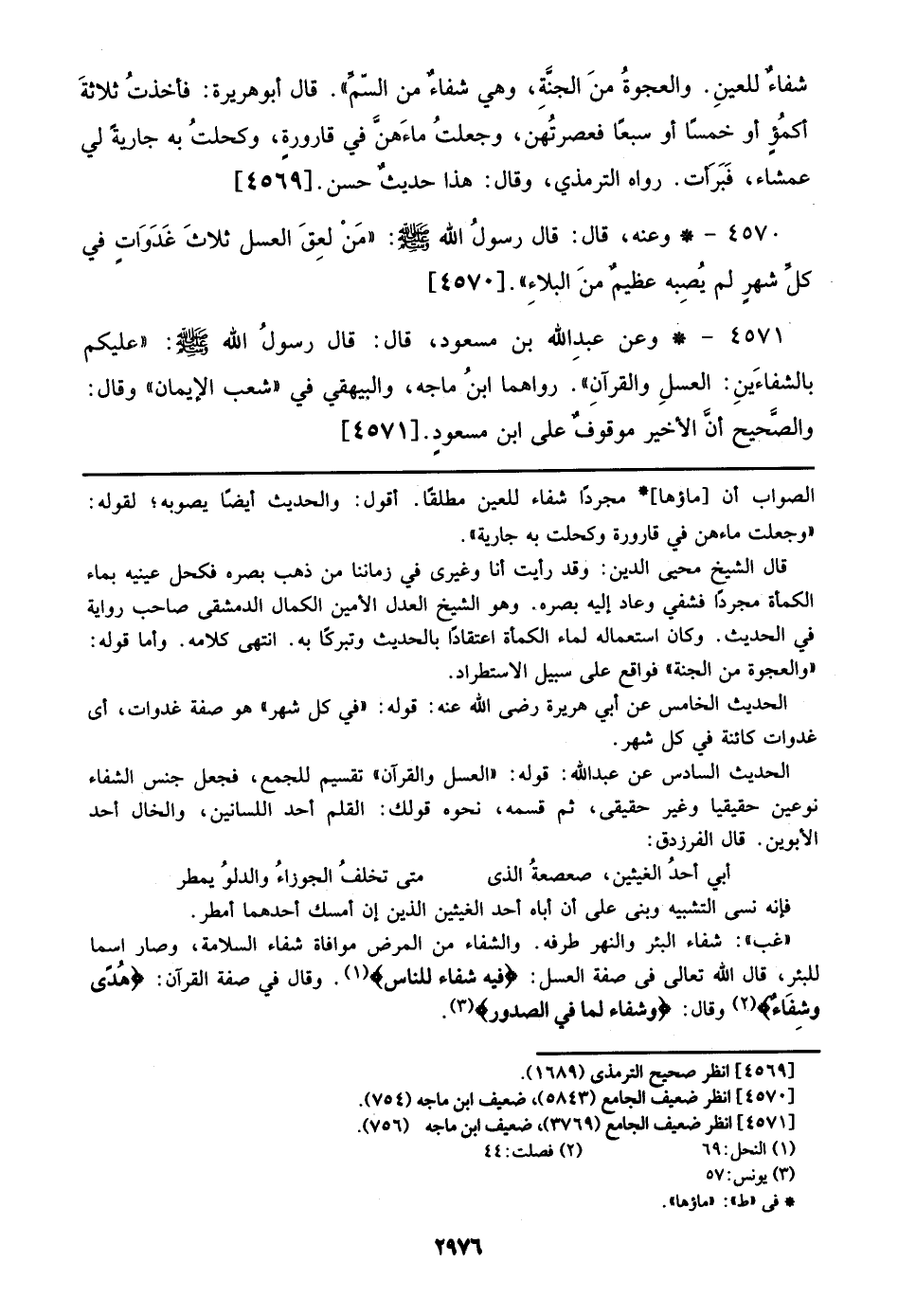 شفاء للعين. والعجوة من الجنة، وهي شفاء من السم)). قال أبو هريرة: فأخذت ثلاثة أكمؤ أو خمساً أو سبعاً فعصرتهن، وجعلت ماءهن في قارورة، وكحلت به جارية لي عمشاء، فبرأت. رواه الترمذي، وقال: هذا حديث حسن. [4569]