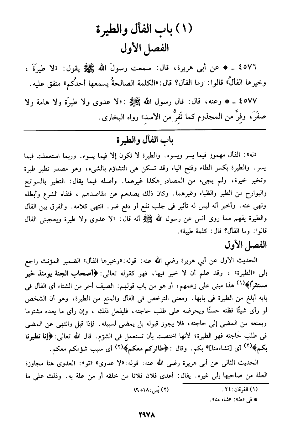 الحديث الأول عن أبي هريرة رضي الله عنه: قوله: ((وخيرها الفأل)) الضمير المؤنث راجع إلى ((الطيرة))، وقد علم أن لا خير فيها، فهو كقوله تعالى: {أَصْحَابُ الجَنَّةِ يَوْمَئِذٍ خَيْرٌ مُّسْتَقَرًا} هذا مبني على زعمهم، أو هو من باب قولهم: الصيف أحر من الشتاء أي الفأل في بابه أبلغ من الطيرة في بابها. ومعنى الترخص في الفأل والمنع من الطيرة، وهو أن الشخص لو رأي شيئاً فظنه حسناً ويحرضه على طلب حاجته، فليفعل ذلك، وإن رأي ما يعده مشئوما ويمنعه من المضي إلى حاجته، فلا يجوز قبوله بل يمضي لسبيله. فإذا قبل وانتهى عن المضي في طلب حاجته فهو الطيرة؛ لأنها اختصت بأن تستعمل في الشؤم. قال الله تعالى: {إنَّا تَطَيَّرْنَا بِكُمْ} أي [تشاءمنا] بكم. قوال: {طَائِرُكُم مَّعَكُمْ} أي سبب شؤمكم معكم.