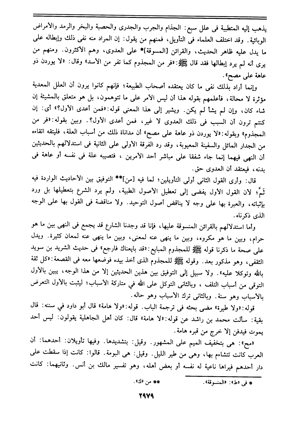 يذهب إليه المتطببة في علل سبع: الجذام والجرب والجدري والحصبة والبخر والرمد والأمراض الوبائية. وقد اختلف العلماء في التأويل، فمنهم من يقول: إن المراد منه نفي ذلك وإبطاله على ما يدل عليه ظاهر الحديث، والقرائن [المسوقة] على العدوى، وهم الأكثرون. ومنهم من يرى أنه لم يرد إبطالها فقد قال صلى الله عليه وسلم: ((فر من المجذوم كما تفر من الأسد)) وقال: ((لا يوردن ذو عاهة على مصح)).