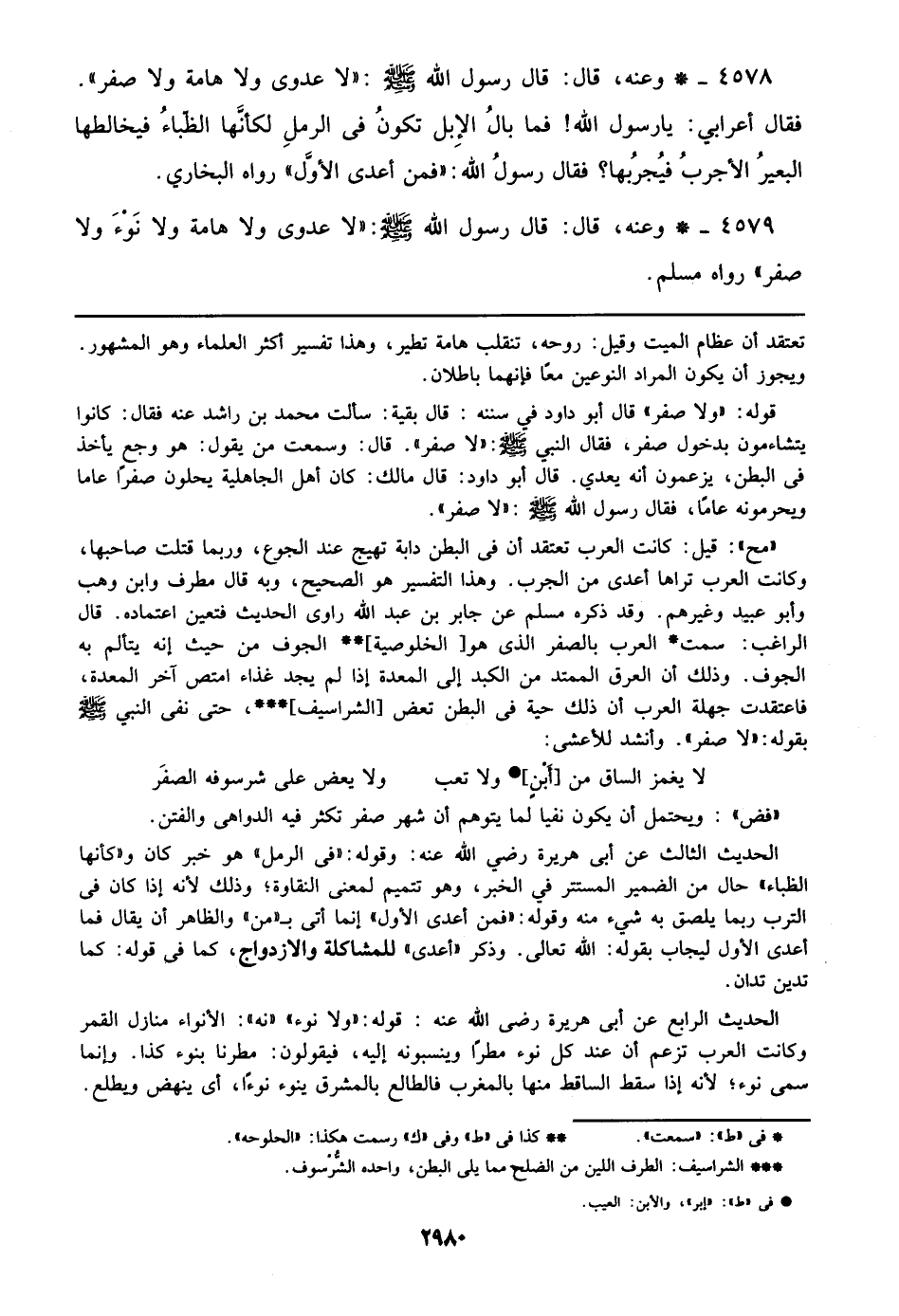 قوله: ((ولا صفر)) قال أبو داود في سننه: قال بقية: سألت محمد بن راشد عنه فقال: كانوا يتشاءمون بدخول صفر، فقال النبي صلى الله عليه وسلم: ((لا صفر)). قال: وسمعت من يقول: هو وجع يأخذ في البطن، يزعمون أنه يعدي. قال أبو داود: قال مالك: كان أهل الجاهلية يحلون صفرا عاما ويحرمونه عاما، فقال رسول الله صلى الله عليه وسلم: ((لا صفر)).