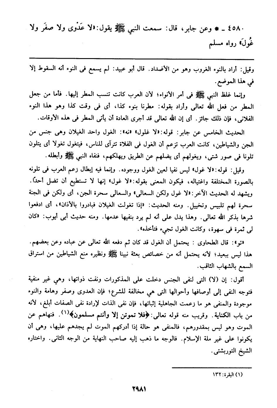 أقول: إن (لا) التي لنفي الجنس دخلت على المذكورات ونفت ذواتها، وهي غير منفية فتوجه النفي إلى أوصافها وأحوالها التي هي مخالفة للشرع؛ فإن العدوى وصفر وهامة والنوء موجودة والمنفي هو ما زعمت الجاهلية إثباتها، فإن نفي الذات لإرادة نفي الصفات أبلغ، لأنه من باب الكناية. وقريب منه قوله تعالى: {فَلا تَمُوتُنَّ إلاَّ وأَنتُم مُّسْلِمُونَ}. فنهاهم عن الموت وهو ليس بمقدورهم، فالمنفي هو حالة إذا أدركهم الموت لم يجدهم عليها، وهي أن يكونوا على غير ملة الإسلام. فالوجه ما ذهب إليه صاحب النهاية من الوجه الثاني. واختاره الشيخ التوربشتى.