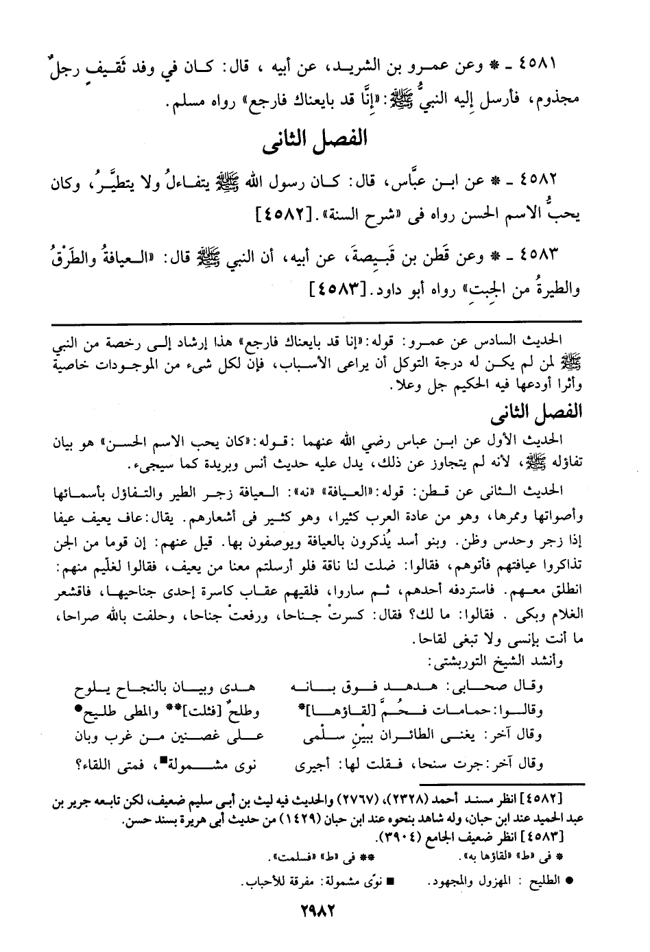 4582 - عن ابن عباس، قال: كان رسول الله صلى الله عليه وسلم يتفاءل ولا يتطير، وكان يحب الاسم الحسن رواه في ((شرح السنة)). [4582]