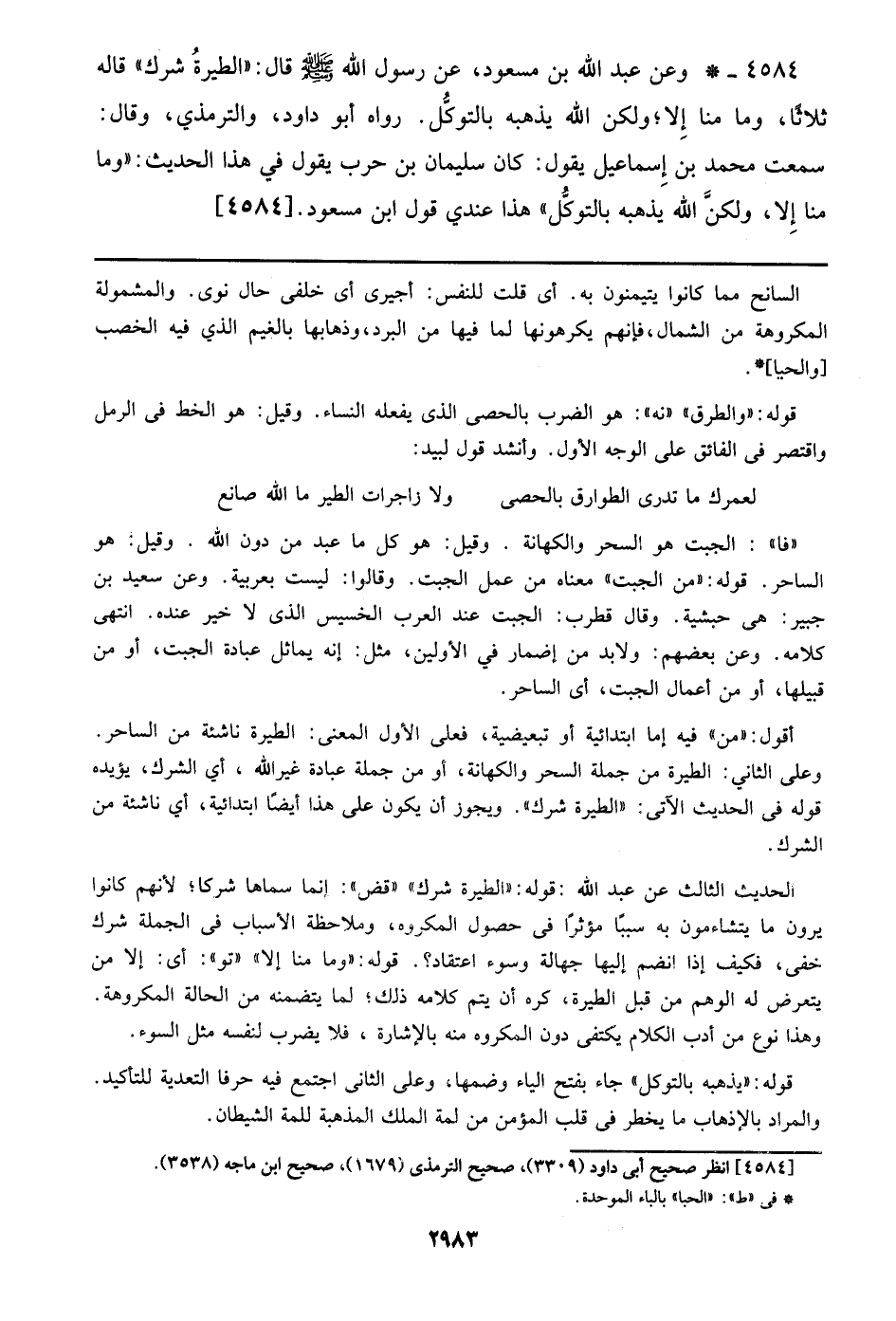 4584 - وعن عبد الله بن مسعود، عن رسول الله صلى الله عليه وسلم قال: ((الطيرة شرك)) قاله ثلاثا، وما منا إلا؛ ولكن الله يذهبه بالتوكل. رواه أبو داود، والترمذي، وقال: سمعت محمد بن إسماعيل يقول: كان سليمان بن حرب يقول في هذا الحديث: ((وما منا إلا، ولكن الله يذهبه بالتوكل)) هذا عندي قول ابن مسعود. [4584]