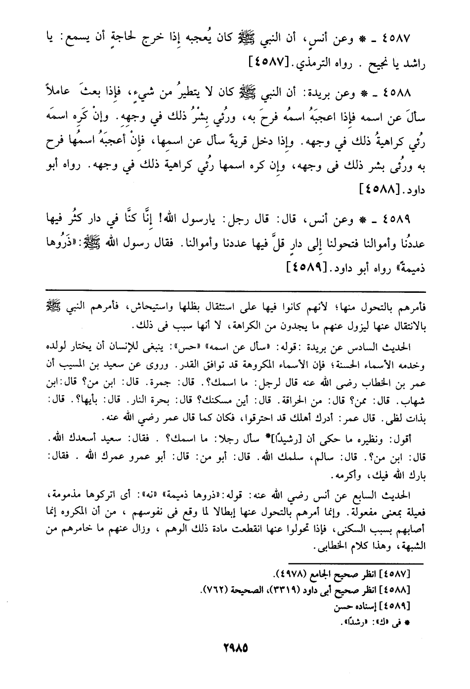 4587 - وعن أنس، أن النبي صلى الله عليه وسلم كان يعجبه إذا خرج لحاجة أن يسمع: يا راشد يا نجيح. رواه الترمذي. [4587]