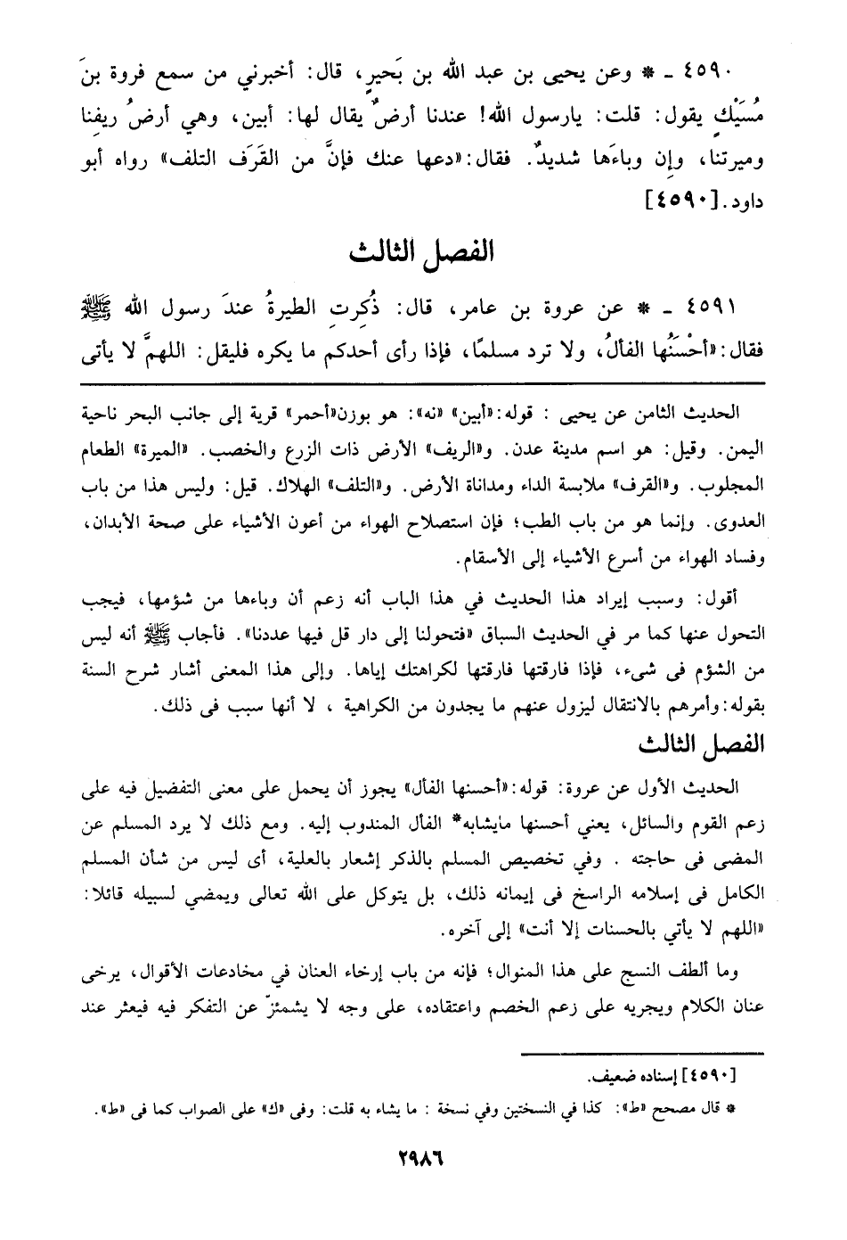 4591 - عن عروة بن عامر، قال: ذكرت الطيرة عند رسول الله صلى الله عليه وسلم فقال: ((أحسنها الفأل، ولا ترد مسلما، فإذا رأي أحدكم ما يكره فليقل: اللهم لا يأتي