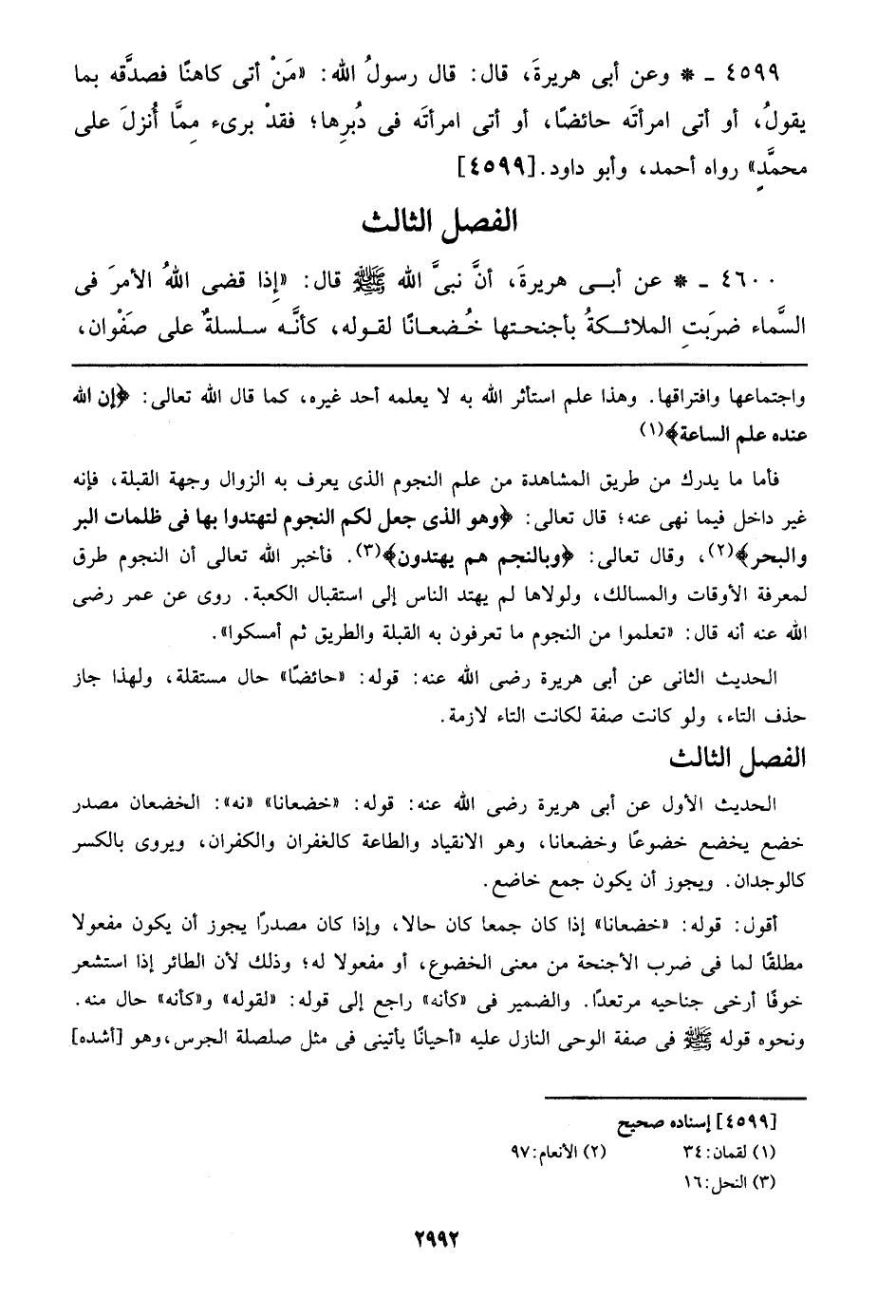 4600 - عن أبي هريرة، أن نبي الله صلى الله عليه وسلم قال: ((إذا قضى الله الأمر في السماء ضربت الملائكة بأجنحتها خضعانا لقوله، كأنه سلسلة على صفوان،