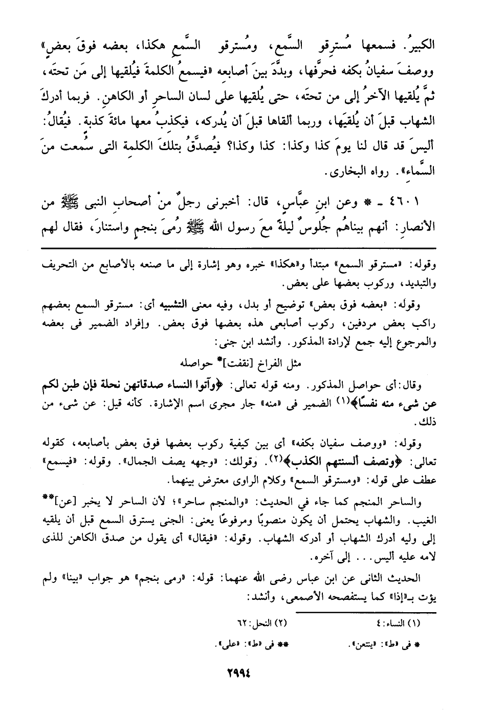 الكبير. فسمعها مسترقو السمع، ومسترقو السمع هكذا، بعضه فوق بعض)) ووصف سفيان بكفه فحرفها، وبدد بين أصابعه ((فيسمع الكلمة فيلقيها إلى من تحته، ثم يلقيا الآخر إلى من تحته، حتى يلقيها على لسان الساحر أو الكاهن. فربما أدرك الشهاب قبل أن يلقيها، وربما ألقاها قبل أن يدركه، فيكذب معها مائة كذبة. فيقال: أليس قد قال لنا يوم كذا وكذا: كذا وكذا؟ فيصدق بتلك الكلمة التي سمعت من السماء)). رواه البخاري.