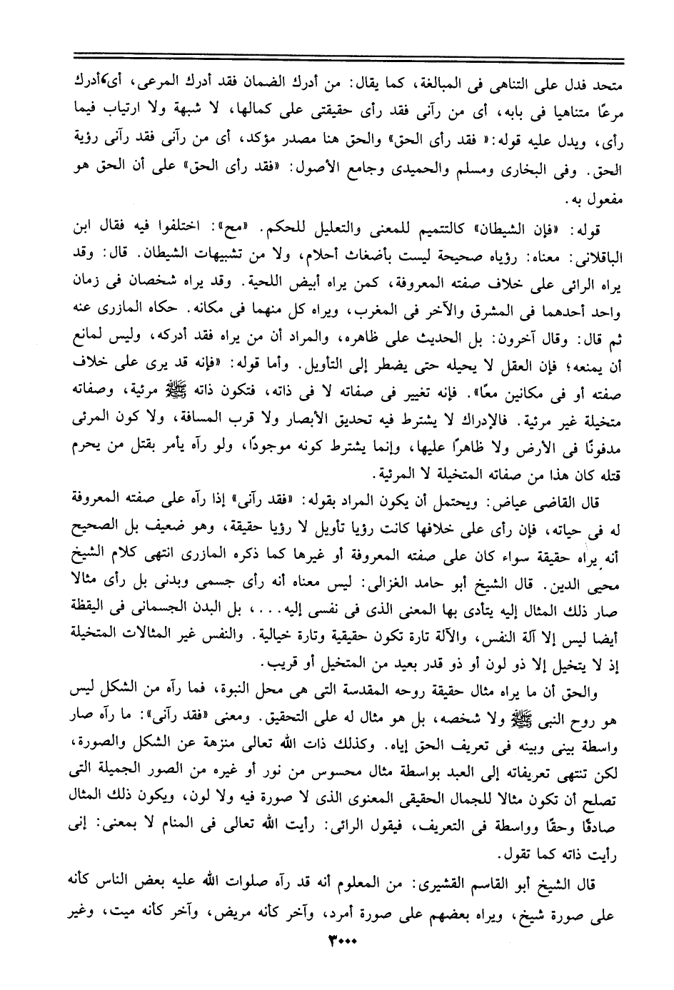 قال القاضي عياض: ويحتمل أن يكون المراد بقوله: ((فقد رآني)) إذا رآه على صفته المعروفة له في حياته، فإن رأي على خلافها كانت رؤيا تأويل لا رؤيا حقيقة، وهو ضعيف بل الصحيح أنه يراه حقيقة سواء كان على صفته المعروفة أو غيرها كما ذكره المازري انتهى كلام الشيخ محيي الدين. قال الشيخ أبو حامد الغزالي: ليس معناه أنه رأي جسمي وبدني بل رأي مثالا صار ذلك المثال إليه يتأدى بها المعنى الذي في نفسي إليه ... ، بل البدل الجسماني في اليقظة أيضا ليس إلا آلة النفس، والآلة تارة تكون حقيقية وتارة خيالية. والنفس غير المثالات المتخيلة إذ لا يتخيل إلا ذو لون أو ذو قدر بعيد من المتخيل أو قريب.